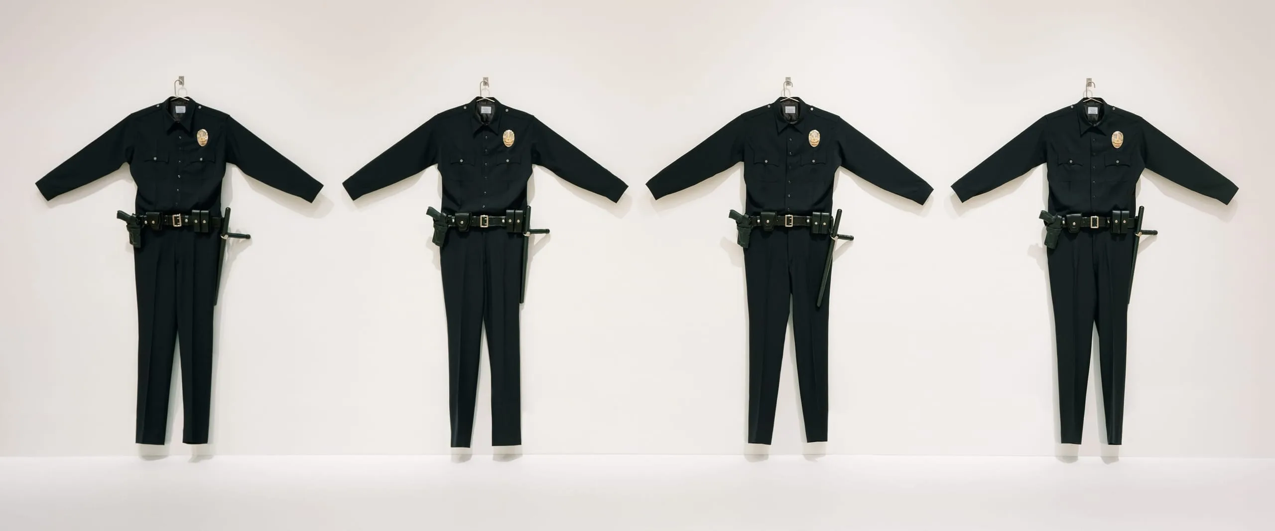 Chris Burden’s work ranges from provocative performances of violence and endurance to explorations of civic infrastructure, including the Urban Light installation in the LACMA entrance plaza and Metropolis II on the first floor of this building. For this piece, Burden collaborated with the Fabric Workshop and Museum in Philadelphia to make thirty oversized replicas of the Los Angeles Police Department uniform, enlarged to fit an imaginary seven-foot, four-inch-tall officer. Produced in the wake of the 1992 Los Angeles uprising, which was sparked by the acquittals of the four white LAPD officers charged with beating Black motorist Rodney King, the uniforms tower over the viewer in an expression of looming institutional authority.