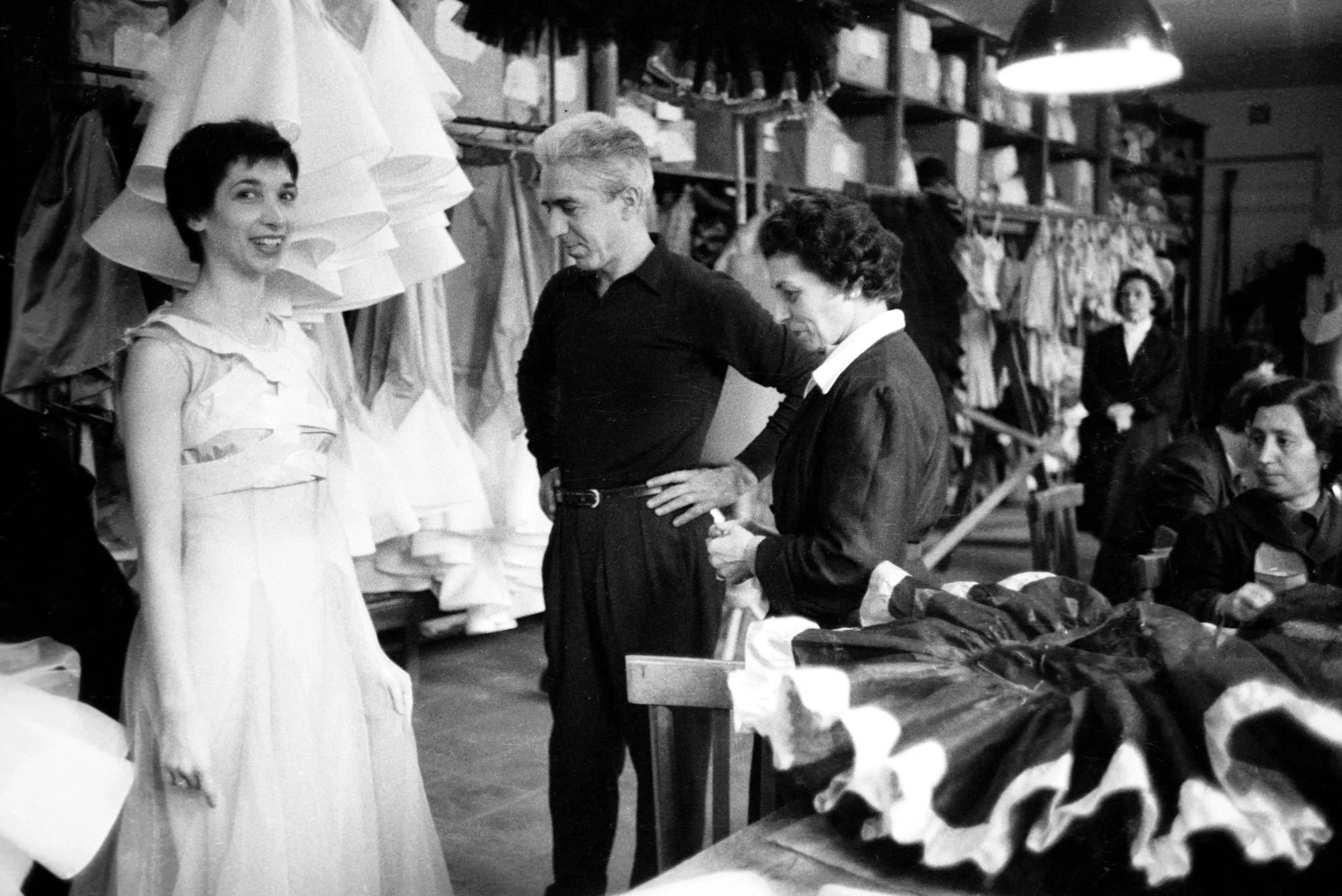 Black and white photograph of four people in a dressmaking workroom, a woman in a full ball gown standing beside two others who appear to be fitting a garment