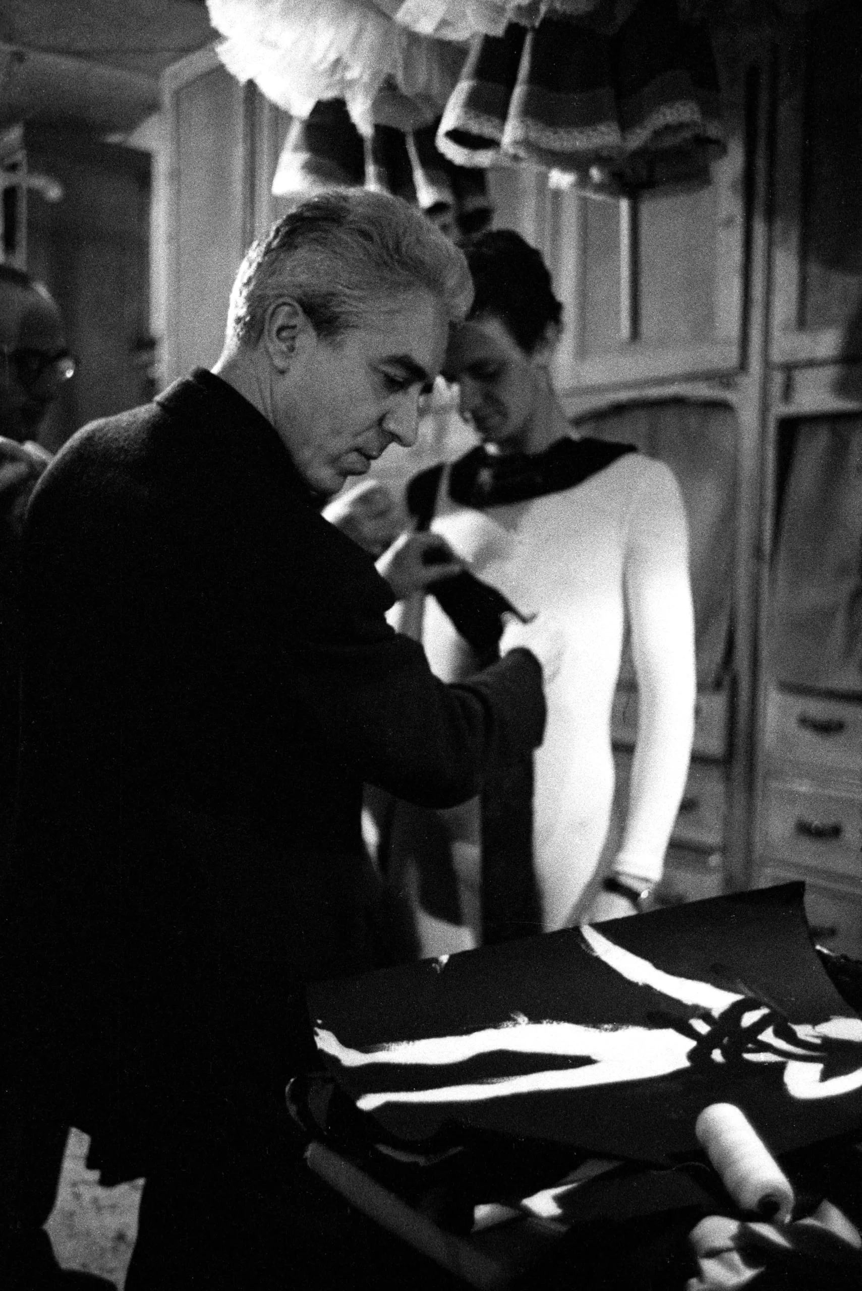 Black and white photograph of an older man leaning over a worktable with dark fabric and white cutout shapes, a woman in a white fitted costume standing behind him in a costume workroom