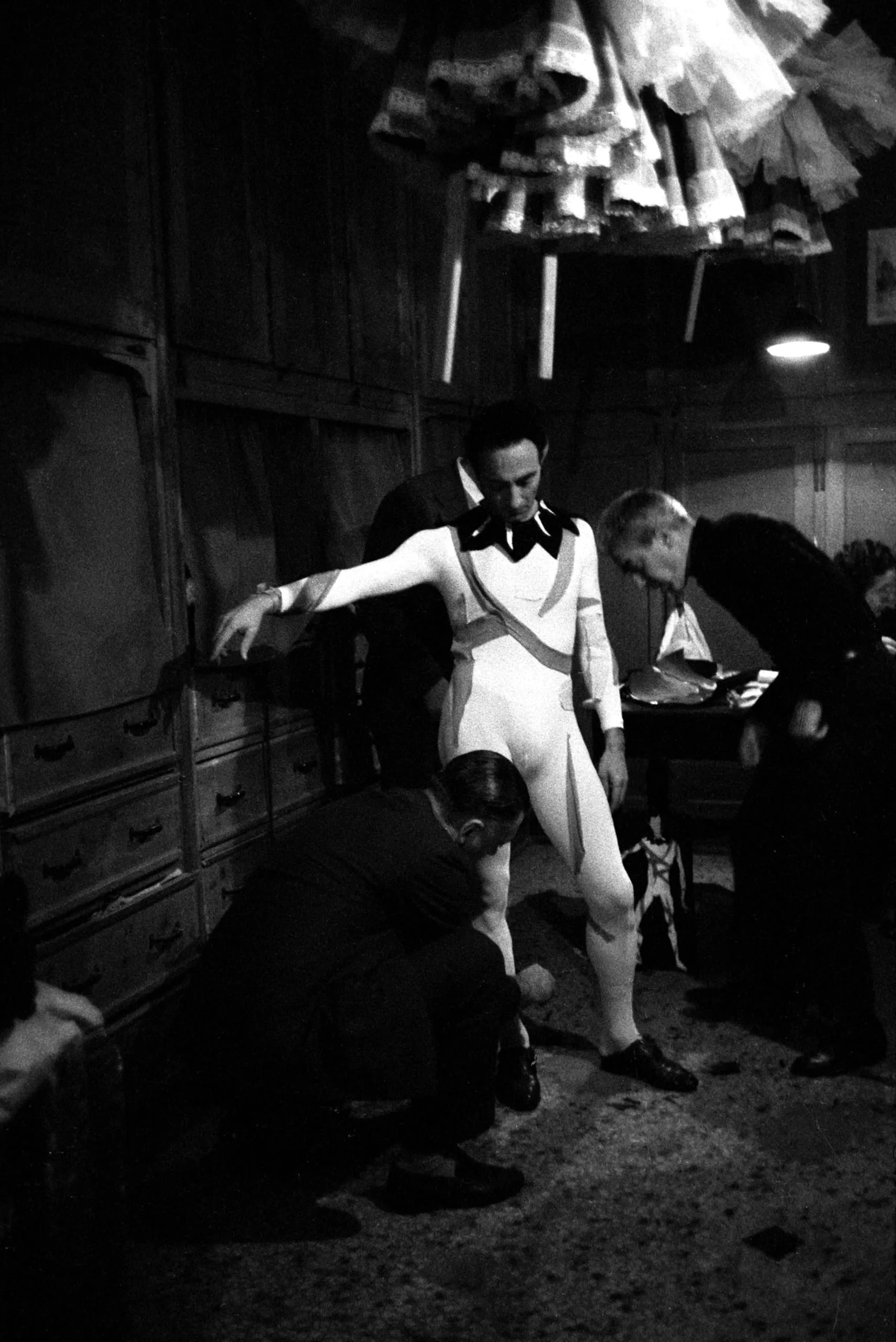 Black and white photograph of a man in a white performance costume with bow tie, standing in a cramped backstage dressing room while two other men attend to him