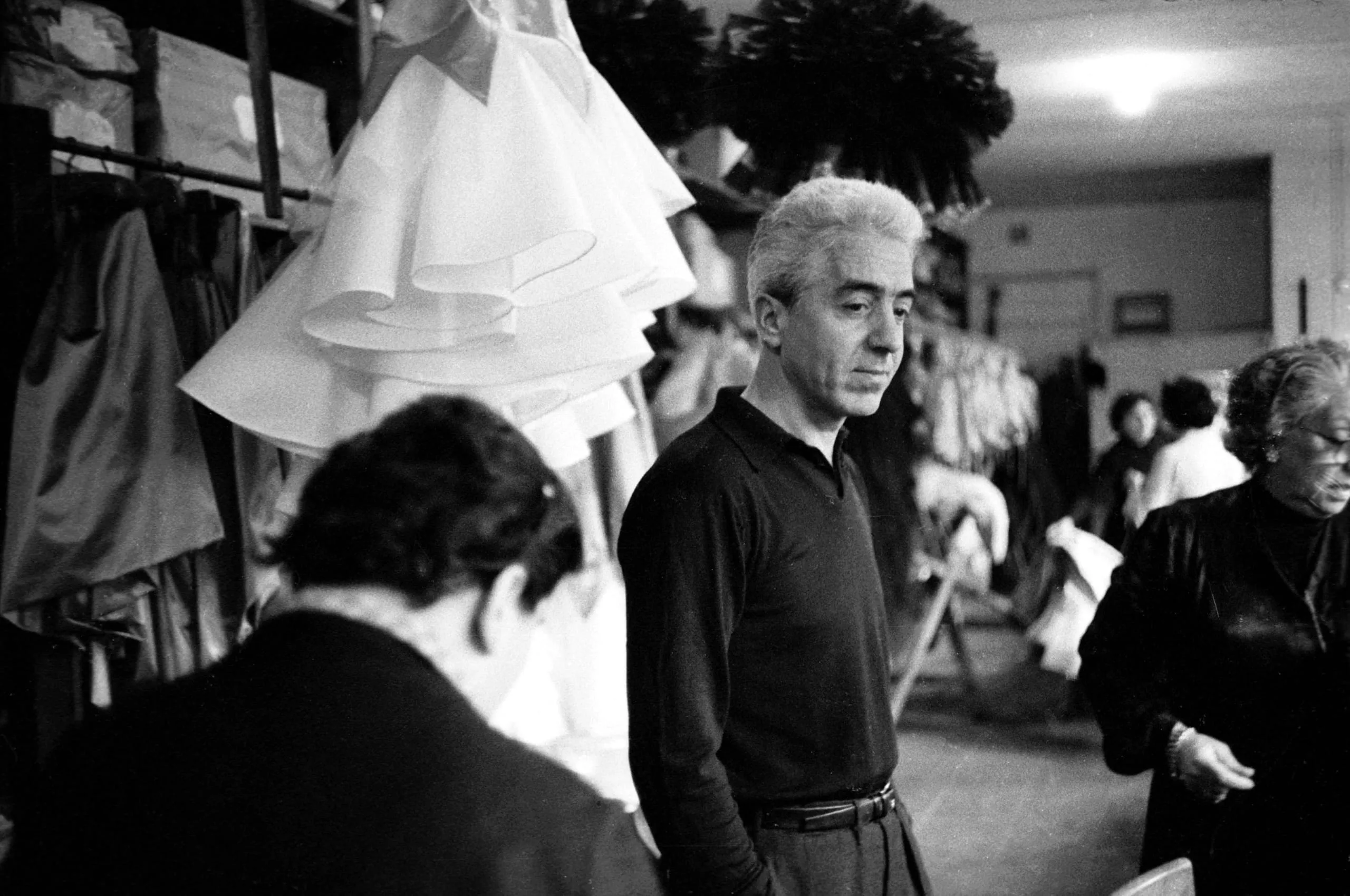 Black and white photograph of a white-haired man in a dark crewneck sweater standing in a backstage room filled with hanging costumes and several other figures