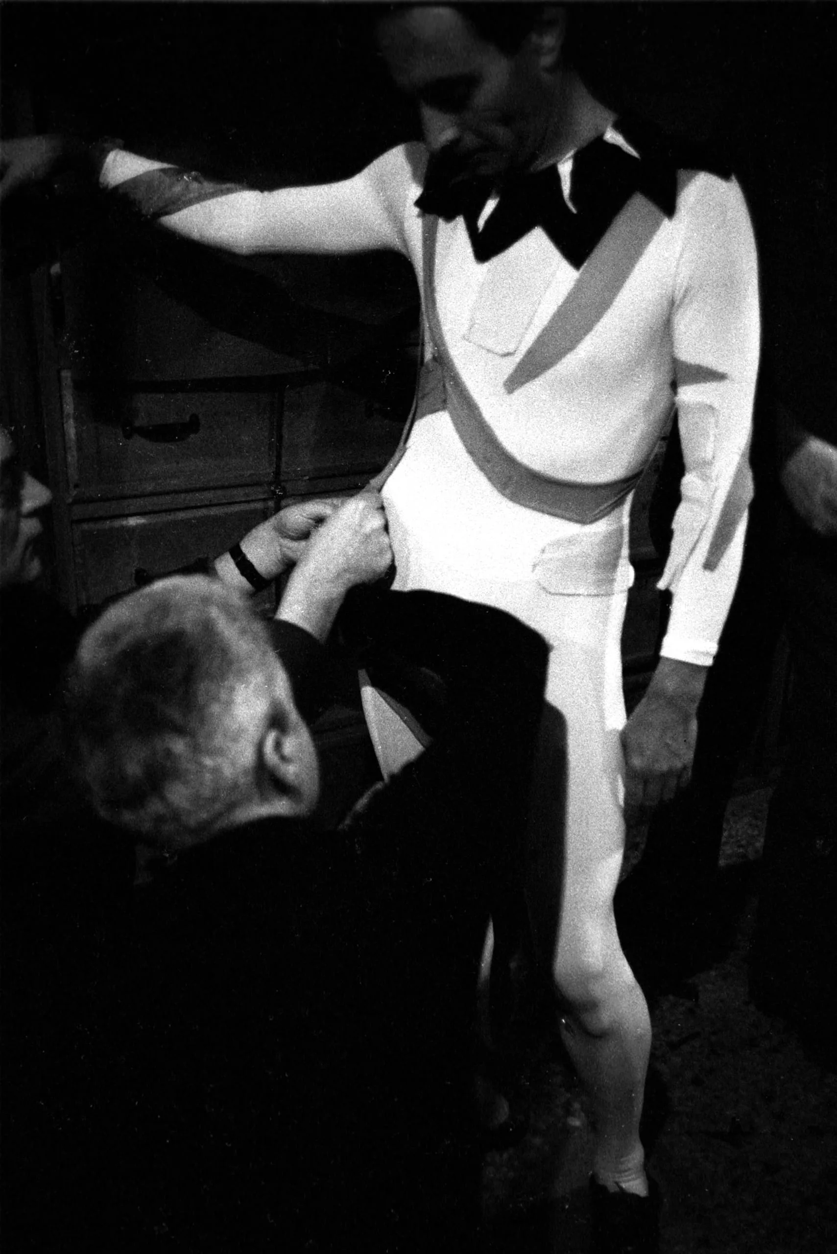 Black and white photograph, one figure in a white costume with a black bow stands while a second, gray-haired figure crouches and adjusts the garment at the waist