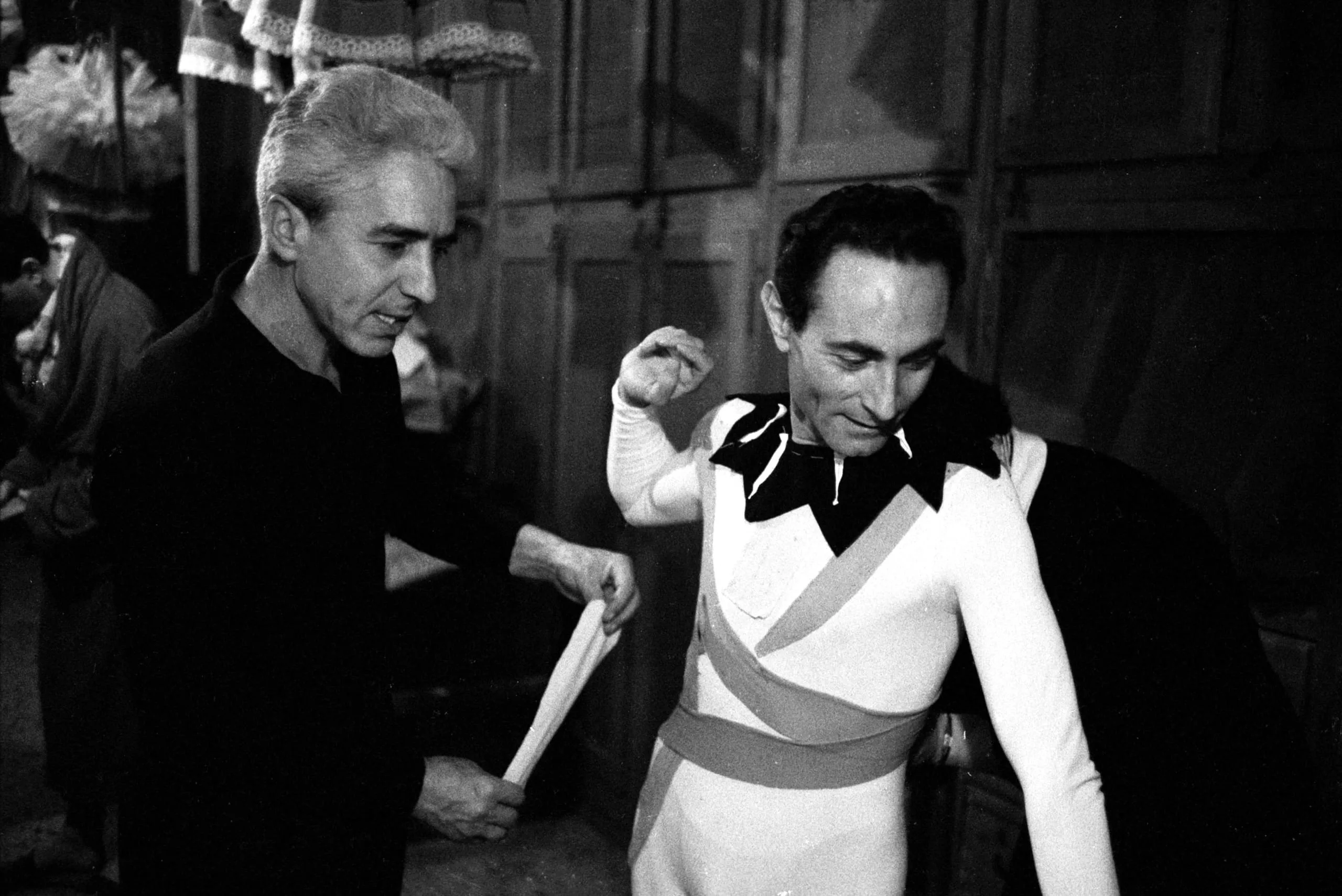 Black and white photograph of two men backstage, one in dark clothing holding a baton, the other in a white performance costume with a dark collar and diagonal sash