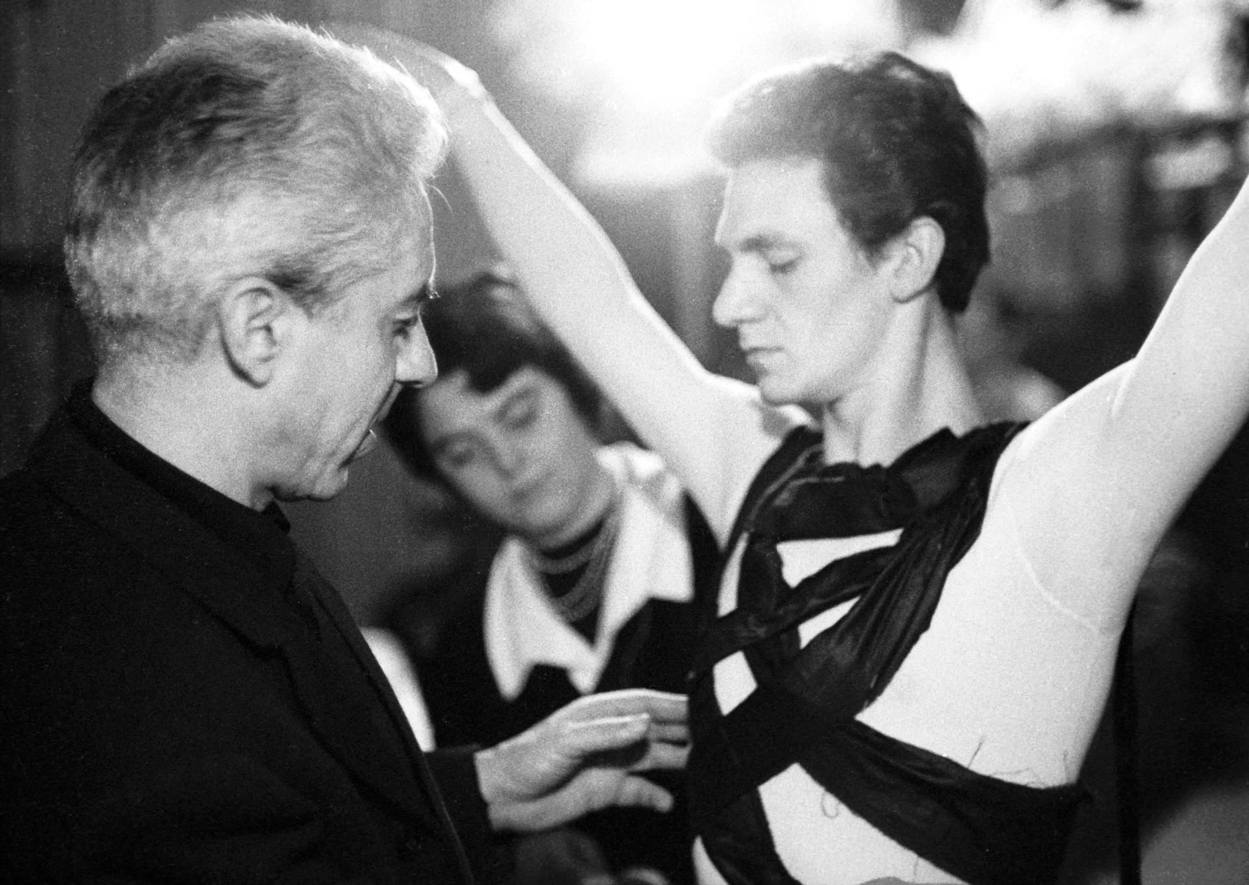 Black and white photograph of an older man in dark clothing reaching toward the torso of a younger man in a white bodysuit with black fabric draped across his chest, arms raised overhead