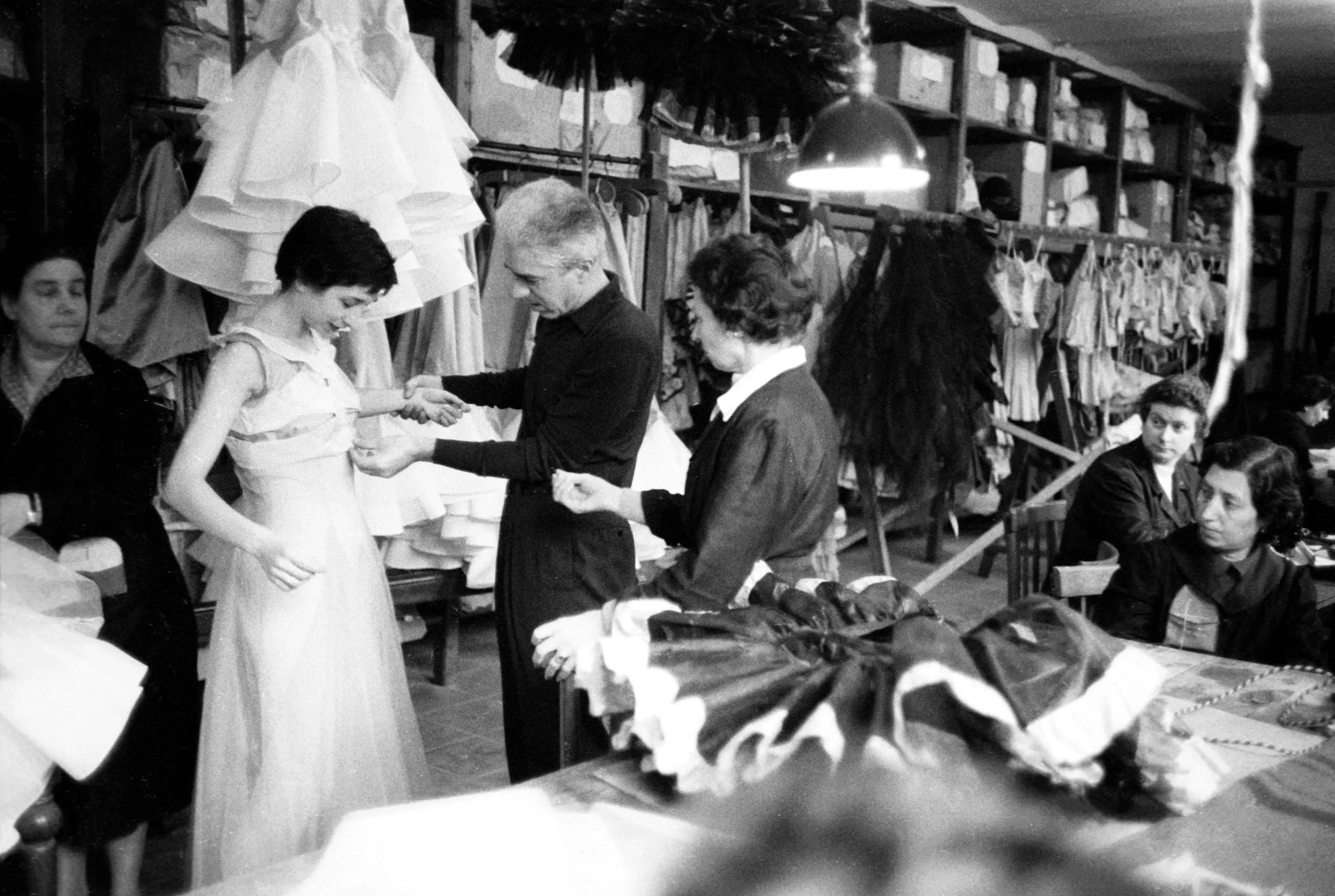 Black and white photograph of a dressmaking or costume workshop, with a model in a long gown being fitted by two attendants while other workers look on