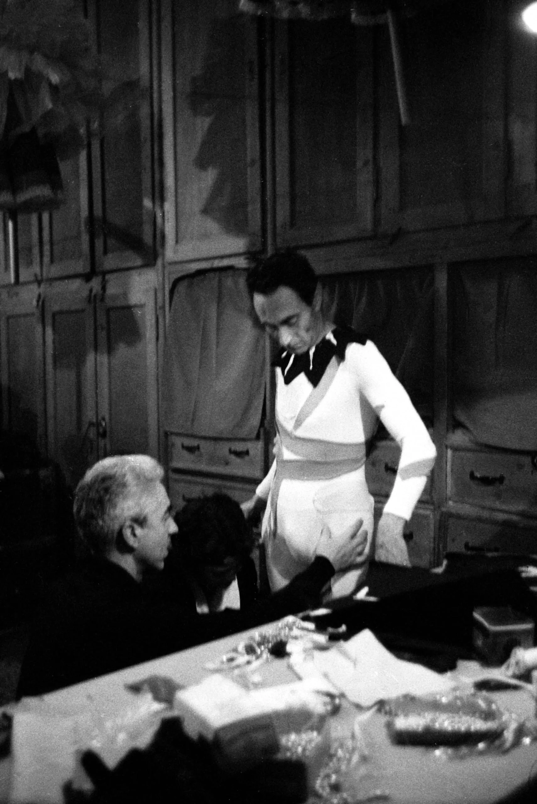 Black and white photograph of two men backstage, one seated at a cluttered table and one standing in a white theatrical costume with dark collar