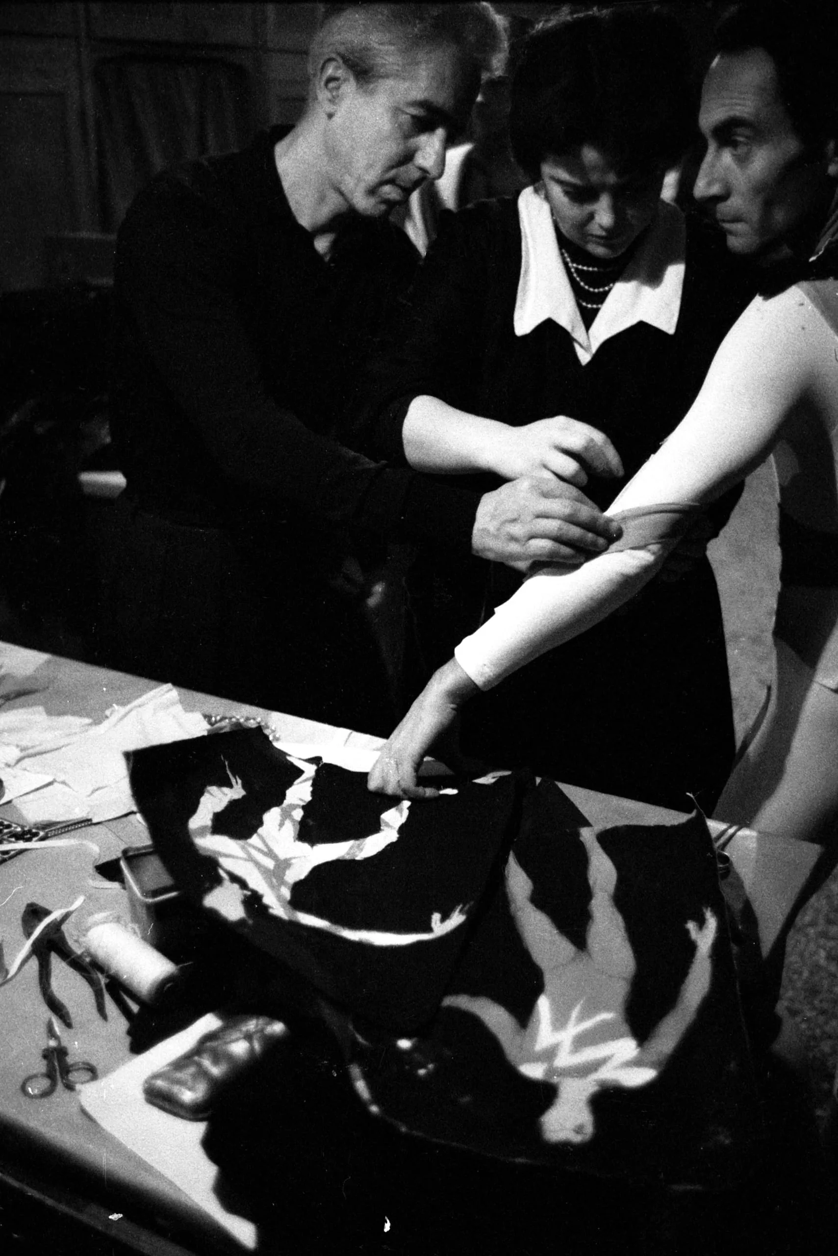Black and white photograph of three figures leaning over a worktable scattered with cut black fabric, tissue paper patterns, scissors, and thread