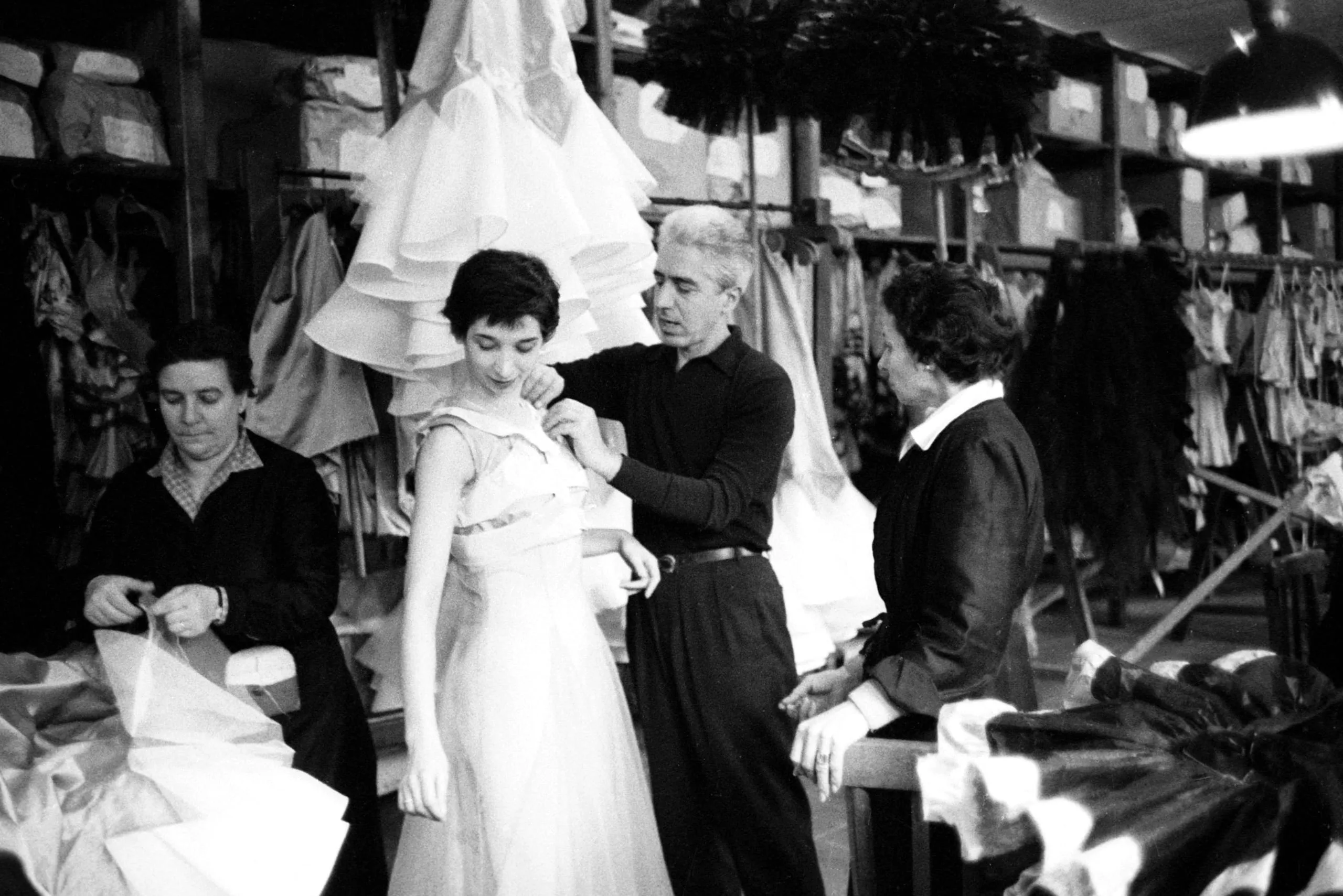 Black and white photograph of four people in a clothing workshop; a man in dark clothing adjusts a pale floor-length gown on a standing woman while two others work nearby