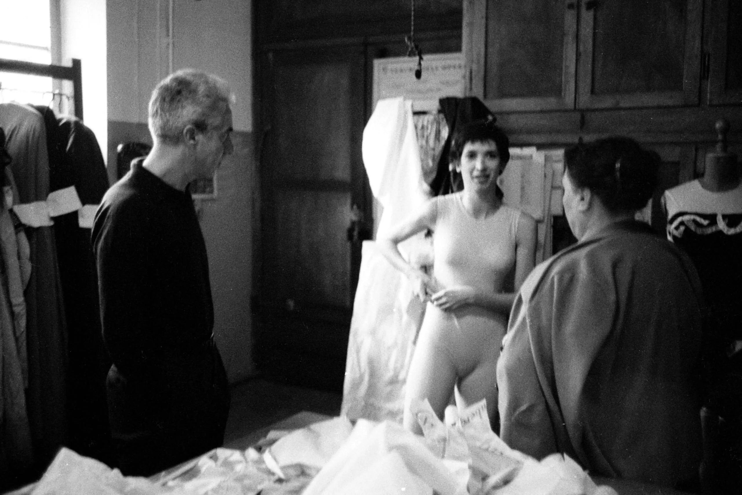 Black and white photograph of three people in a costume workroom, a woman in a fitted bodysuit at center speaking with a man in glasses and a second woman whose back faces us