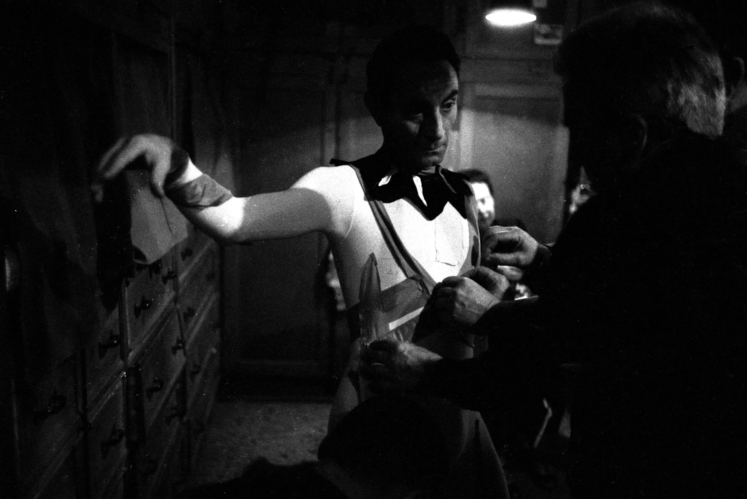 Black and white photograph of a Black man in a pale stage costume and large bow tie, arms outstretched, being dressed or adjusted by a second figure in a dim backstage room