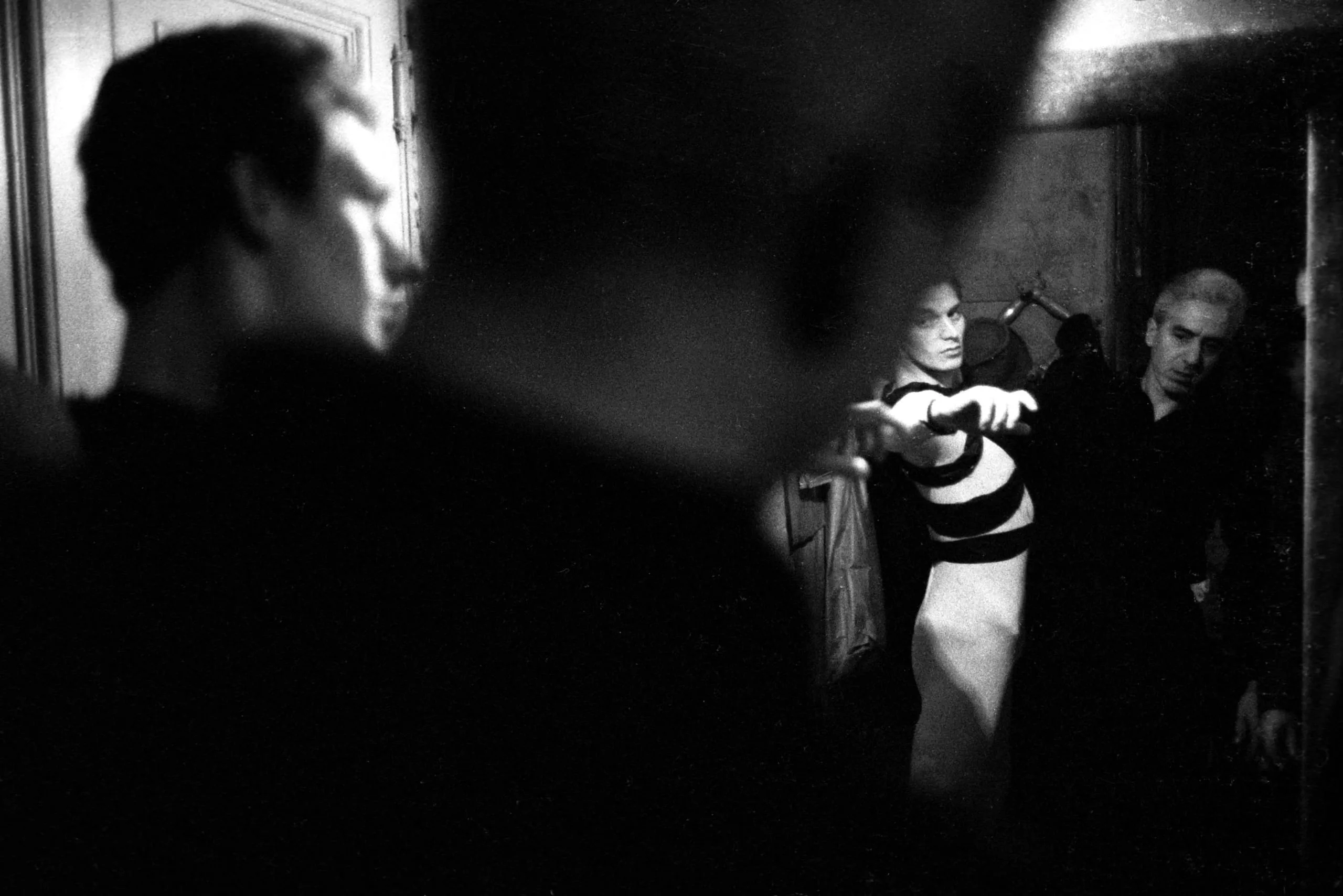 High-contrast black and white photograph of three men in a dimly lit interior, one in silhouette reaching toward two others, one in a striped sweater with arms outstretched