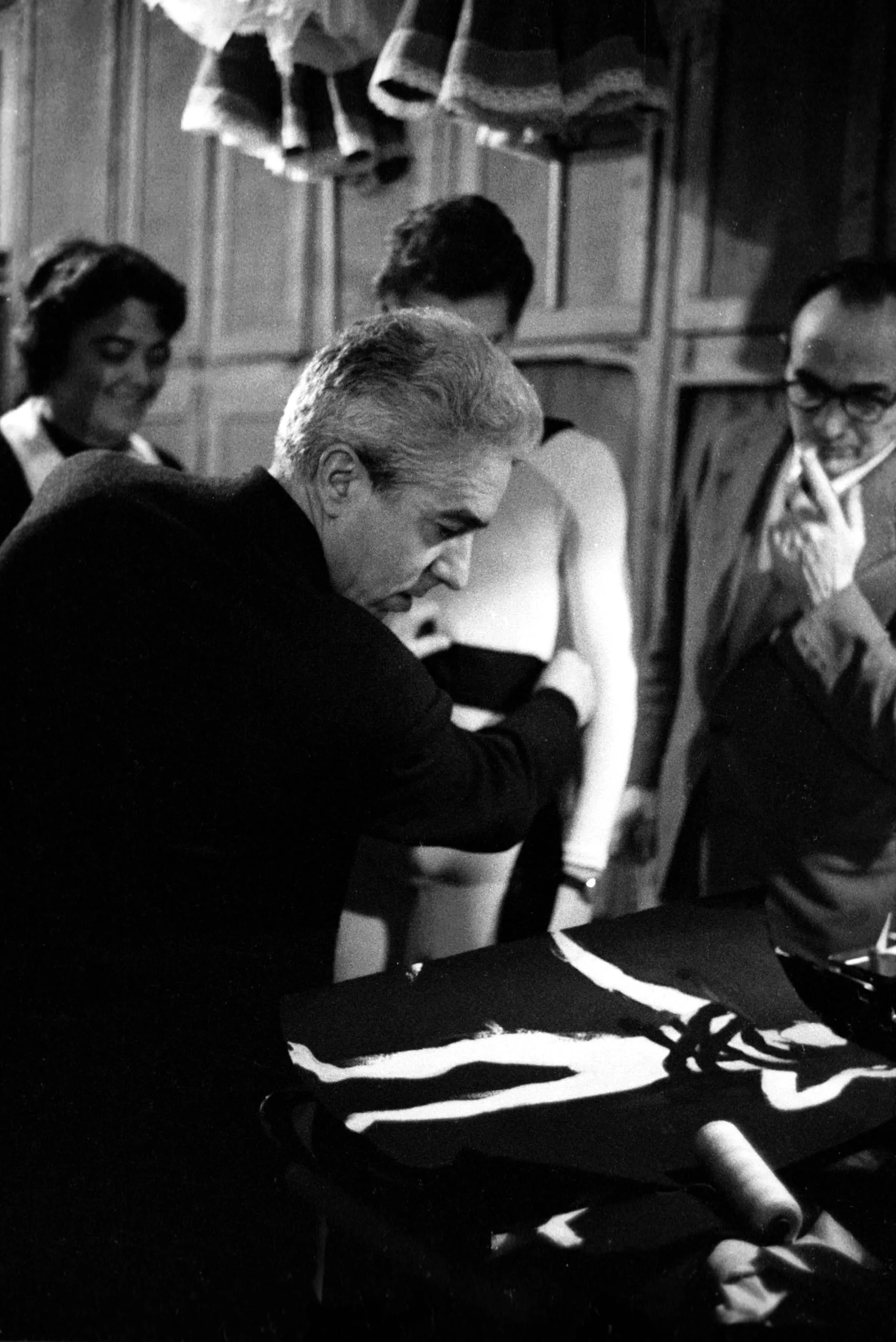 Black and white photograph of a man leaning over a dark fabric-covered worktable, surrounded by three other figures in a wood-paneled interior