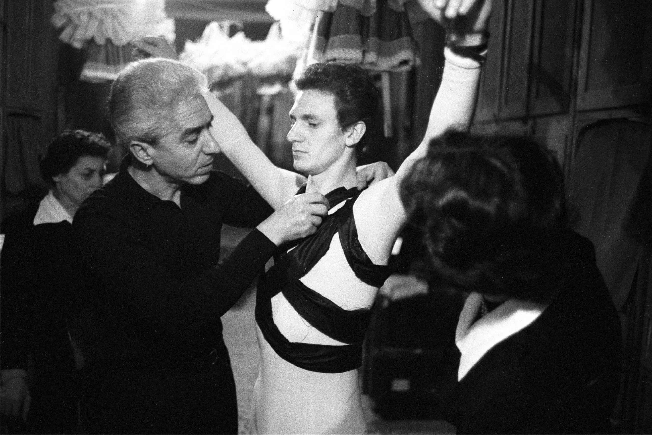 Black and white photograph of three people in a backstage setting, two figures adjusting a dark sash across a white costume worn by a man with his arm raised