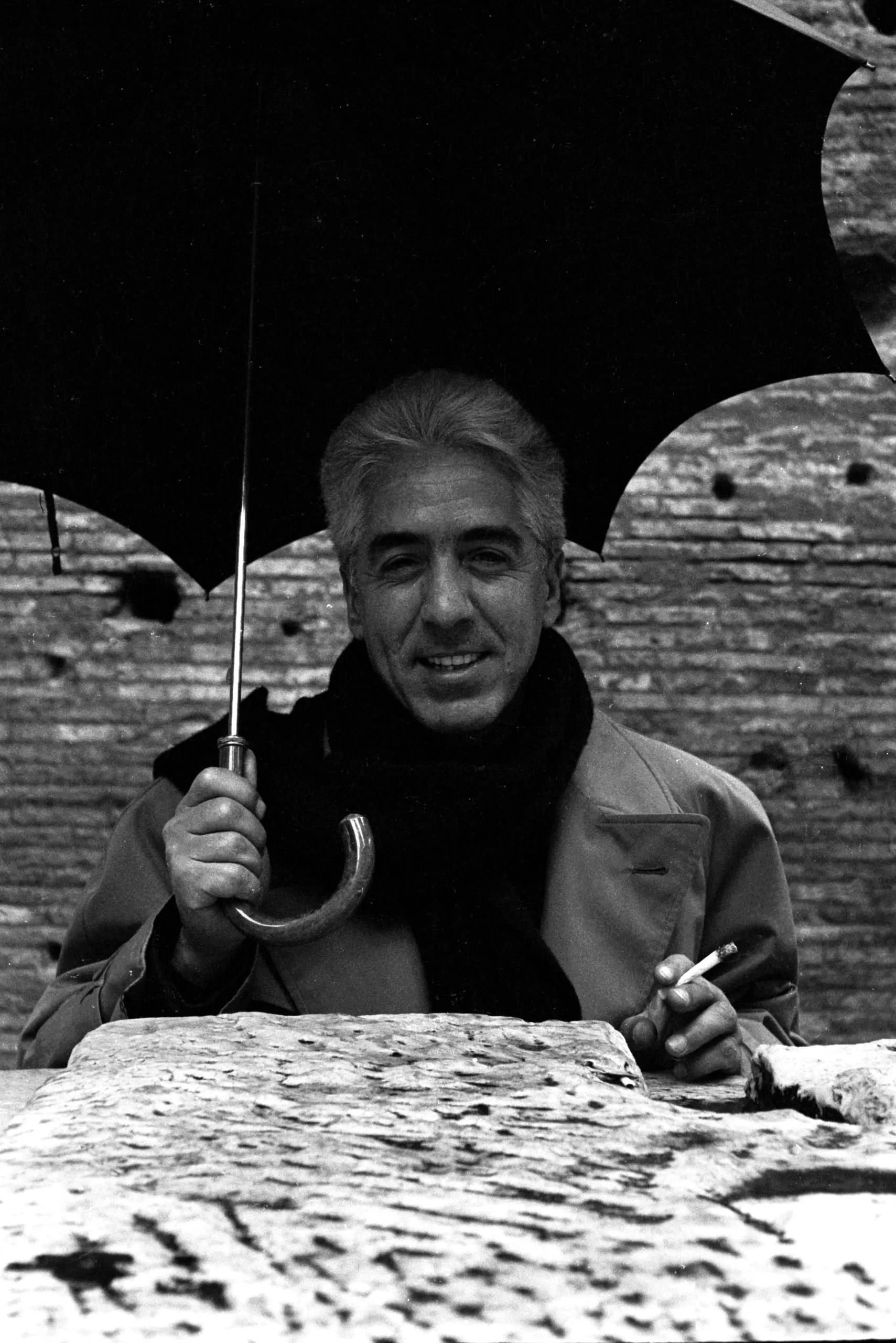 Black and white portrait photograph, man from the chest up holding an open umbrella and a cigarette, smiling at the camera, standing behind a weathered stone ledge with a brick wall behind him