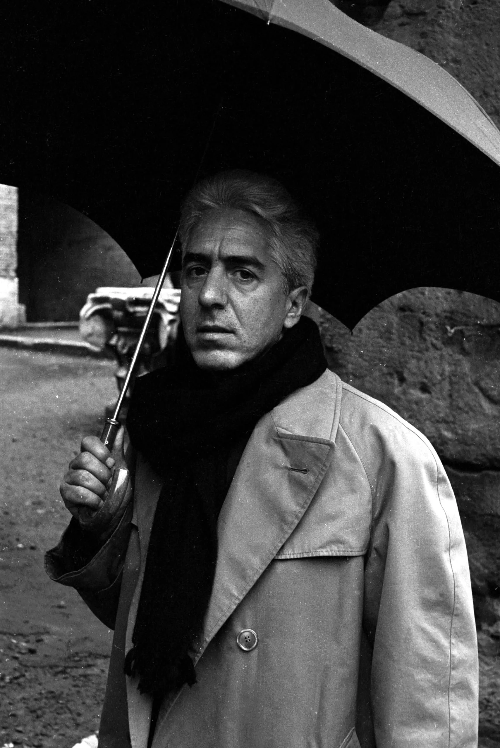 Black and white photograph, waist-up portrait of a man holding an open umbrella, wearing a trench coat and dark scarf, stone arch visible behind him