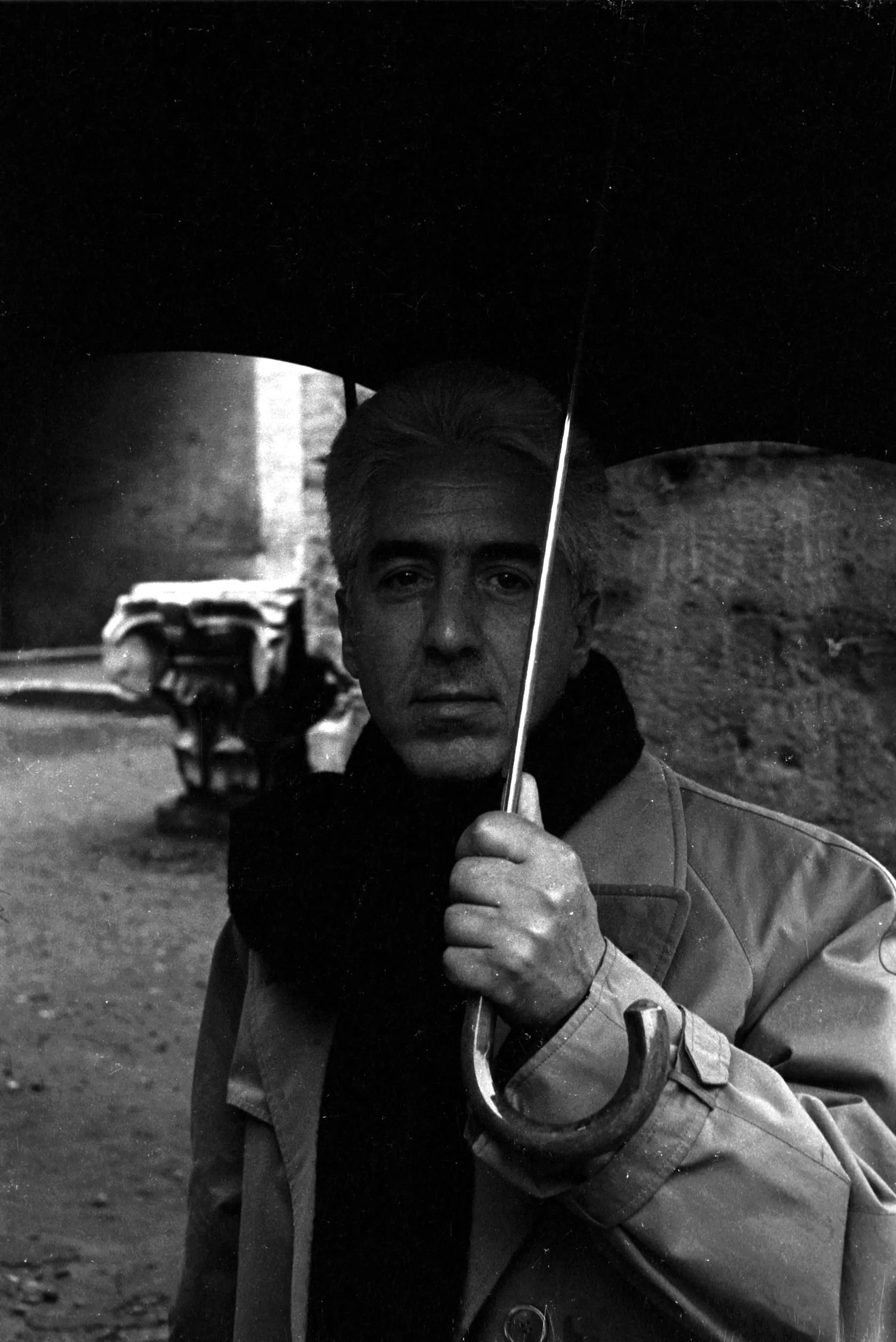 Black and white portrait photograph of a man in a trench coat and scarf holding a dark umbrella close to the camera, looking directly at the viewer