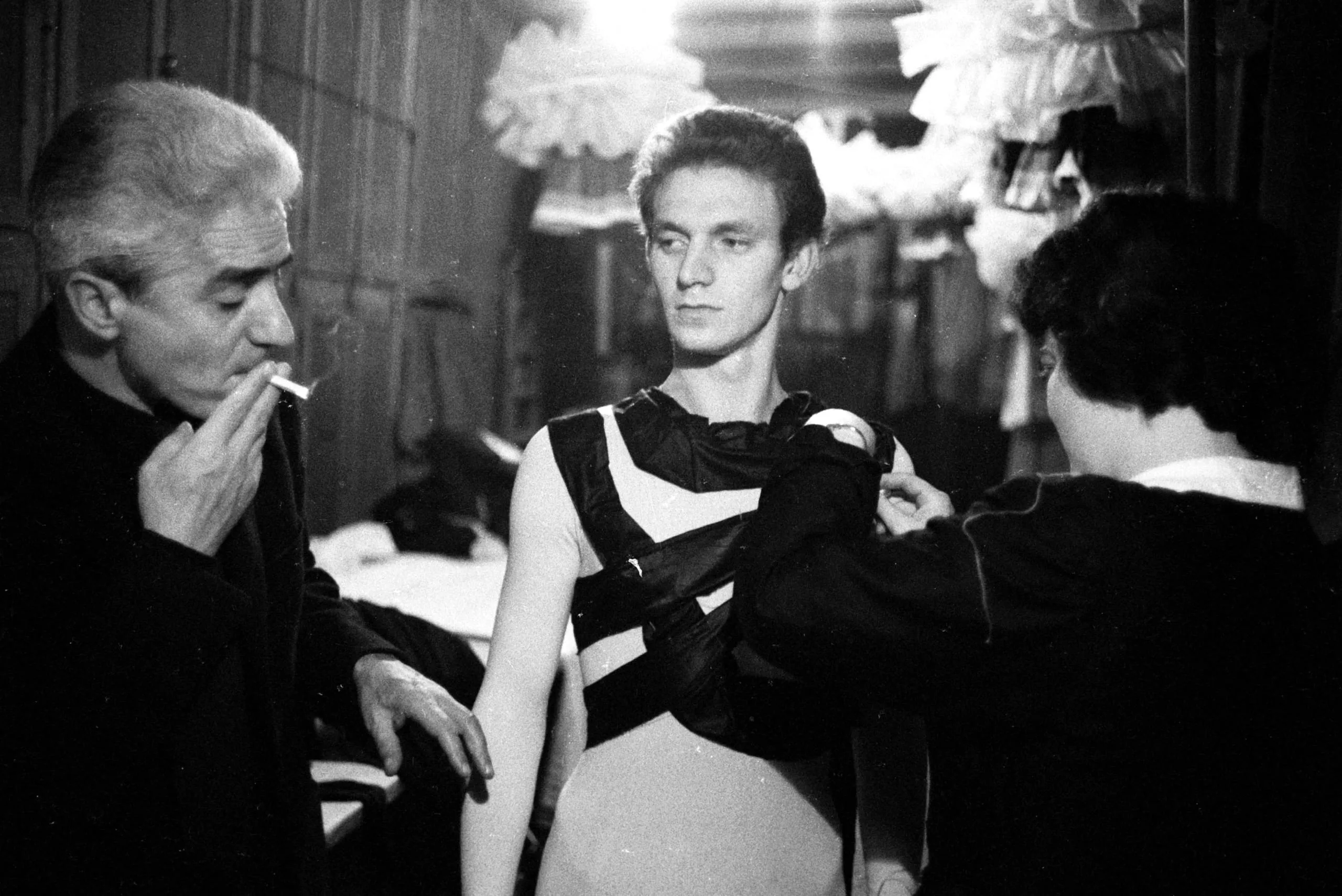 Black and white photograph, three figures backstage, central young man in white costume with dark harness being dressed, older man smoking at left