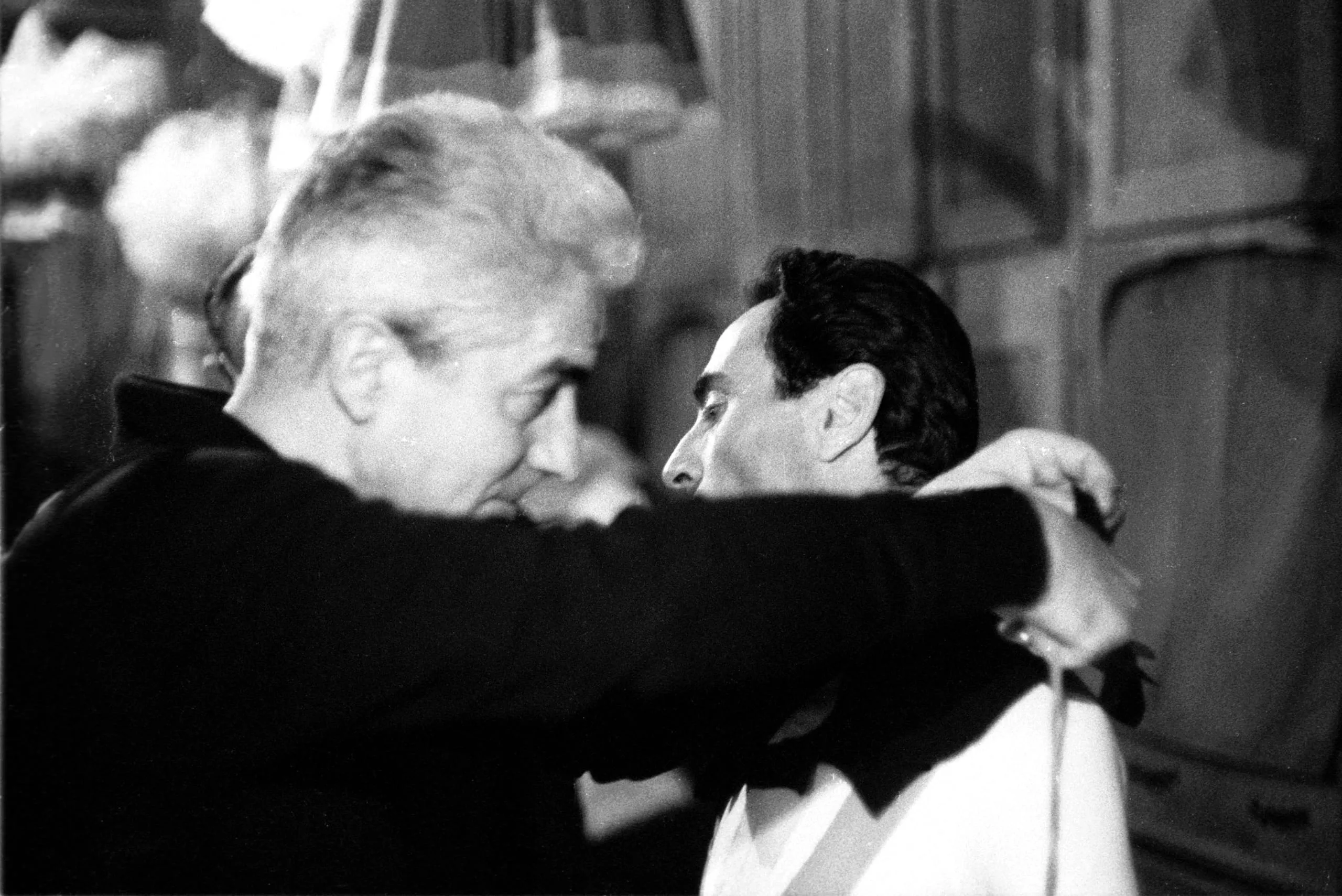 Black and white photograph of two men in close profile, one with white hair extending an arm across the other's shoulders in an indoor setting