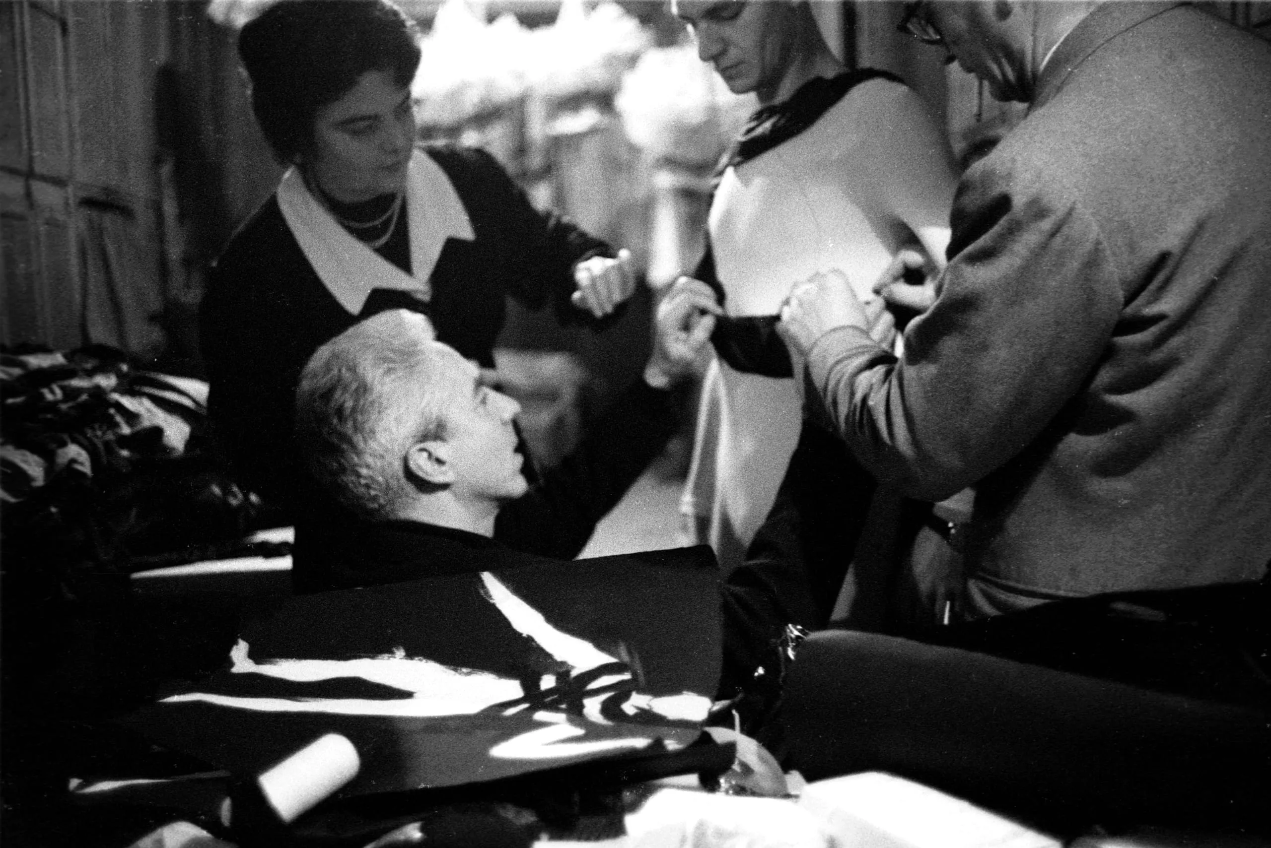Black and white photograph of a white-haired man seated at a dark worktable, surrounded by three figures in a dimly lit interior, with strong directional lighting