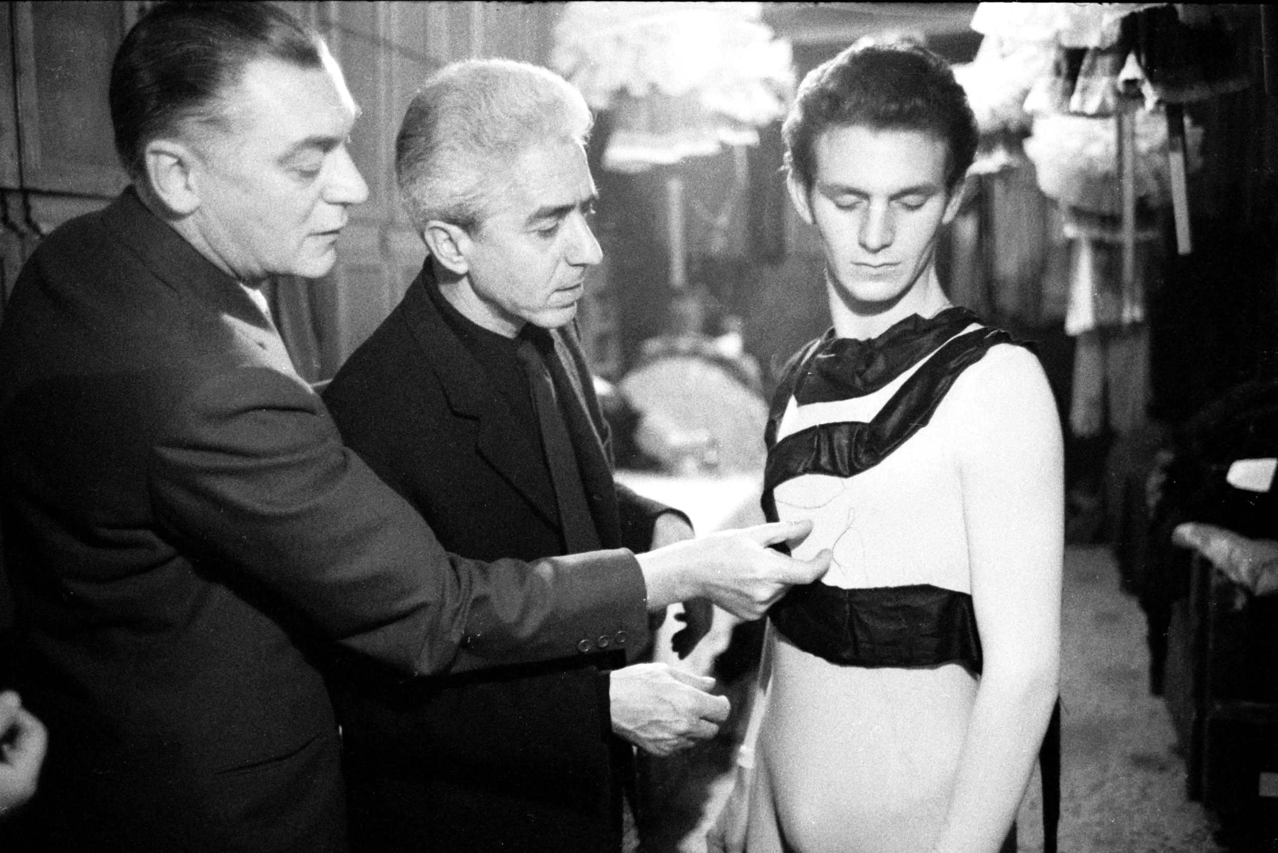 Black and white photograph of two men in dark suits adjusting a structured black and white bodice on a young woman in a fitting room setting