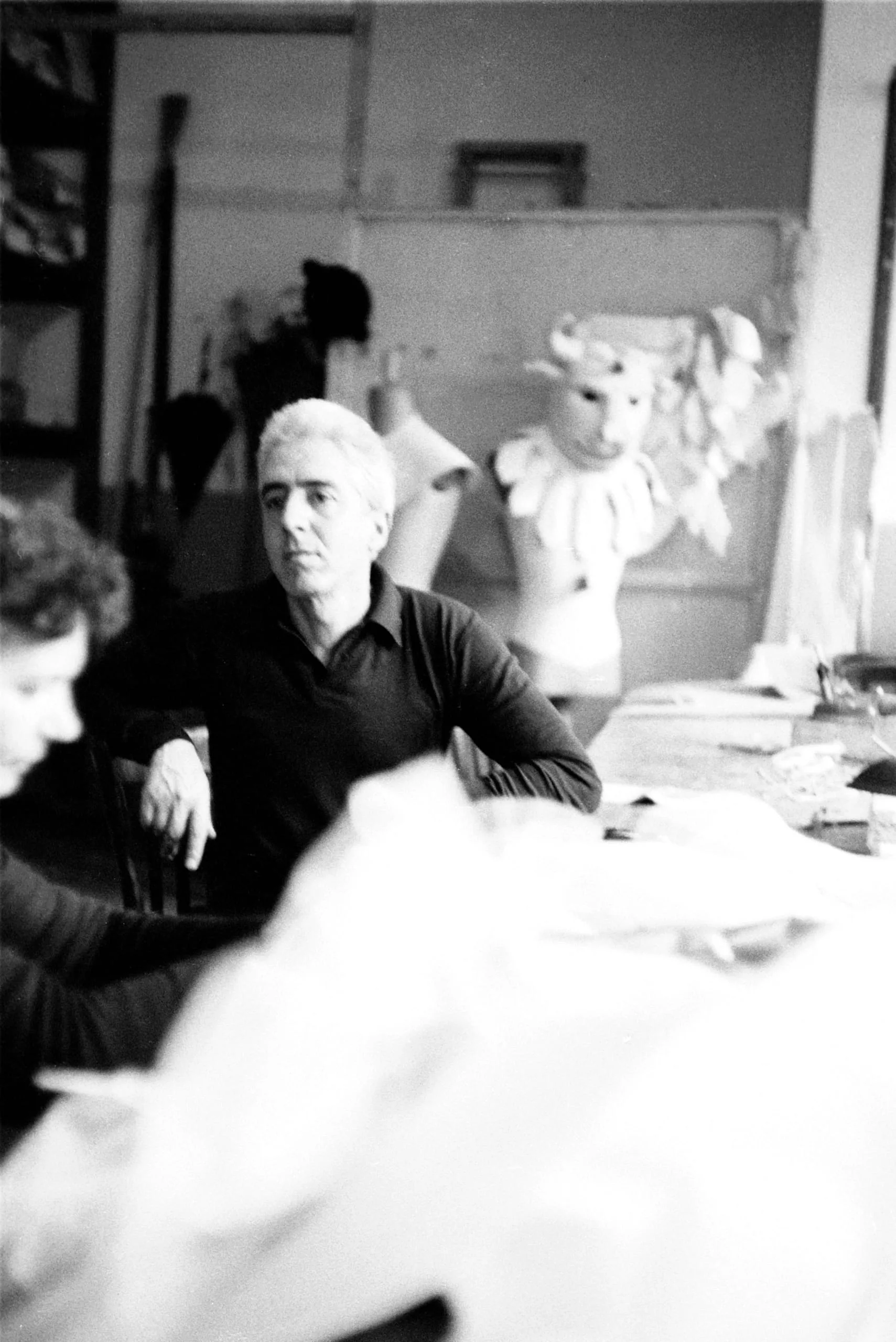 Black and white photograph of a man with light hair in a dark pullover seated at a table in a studio, with a white plaster bust visible in the background