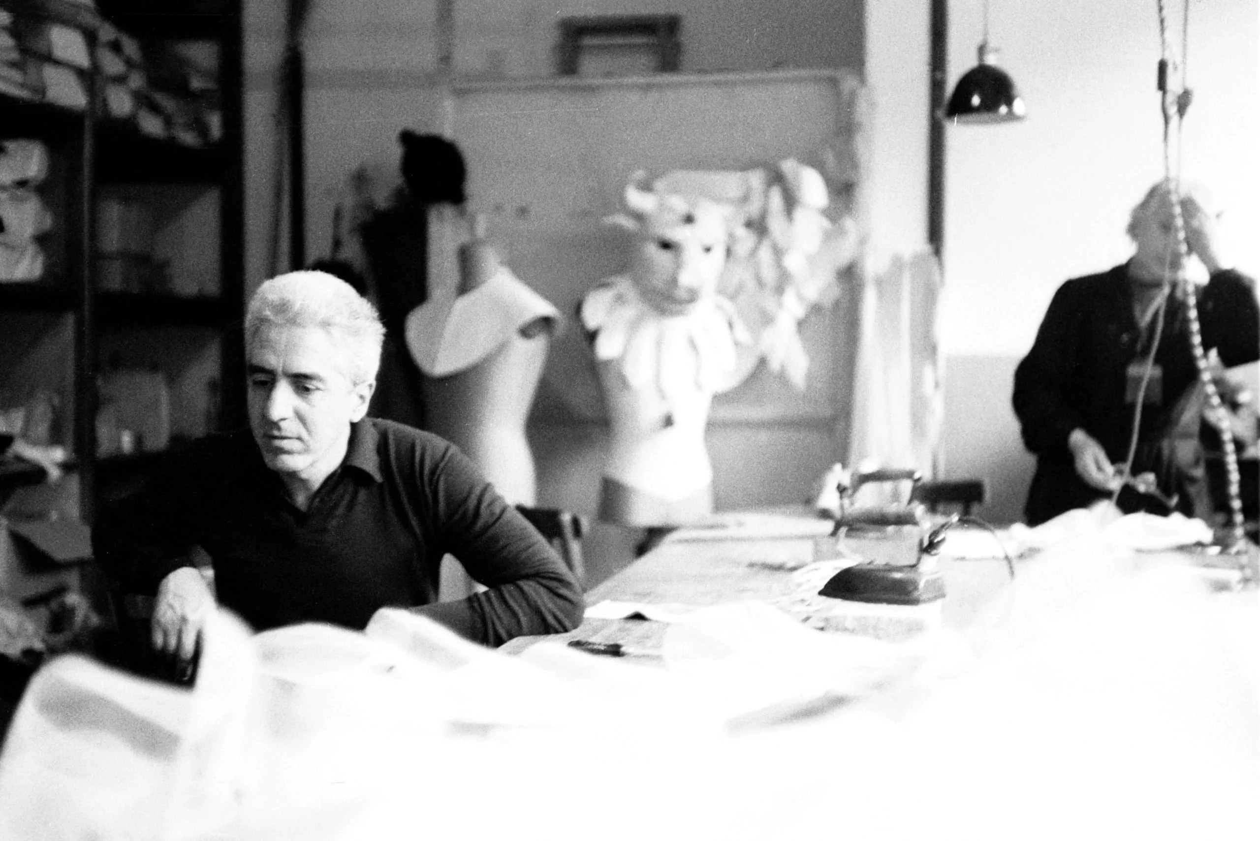 Black and white photograph of a man with white hair seated at a fabric-covered worktable in an atelier, with a costumed dress form and a second figure visible behind him