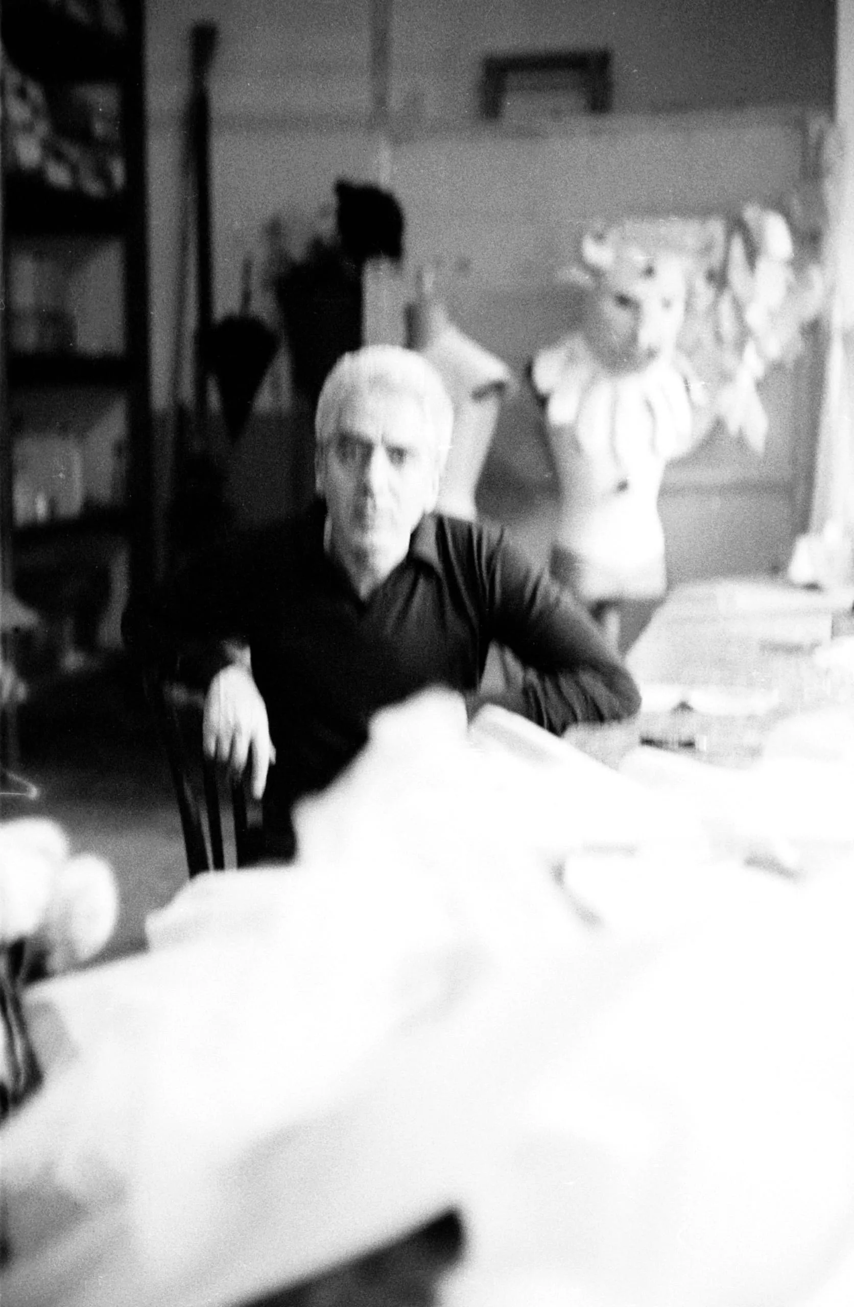Black and white photograph of a white-haired man in a dark shirt seated in an artist's studio, surrounded by plaster sculptures and shelves of tools