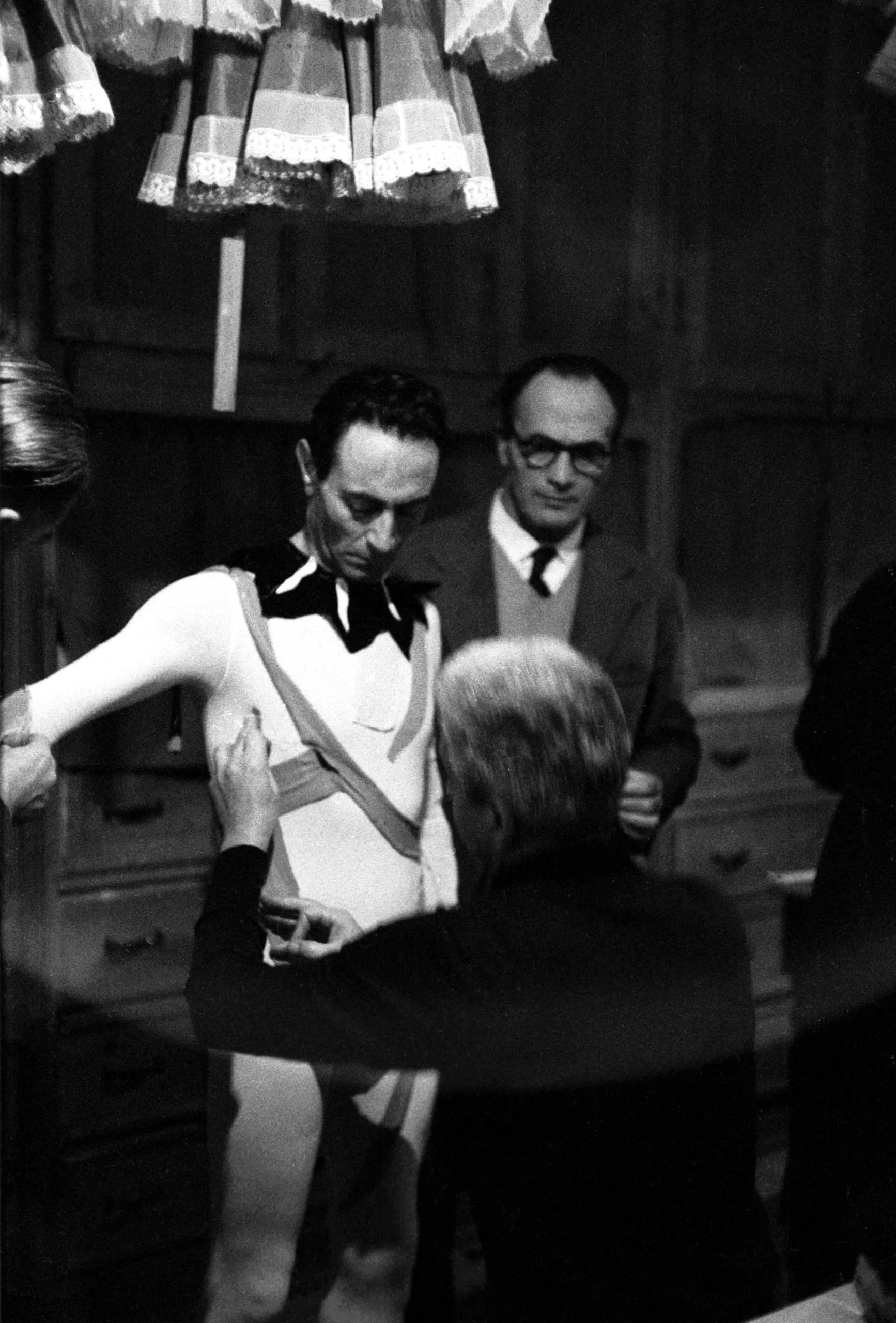 Black and white photograph of a man in a white sleeveless costume being fitted backstage, a second man in glasses observing, tutus hanging overhead