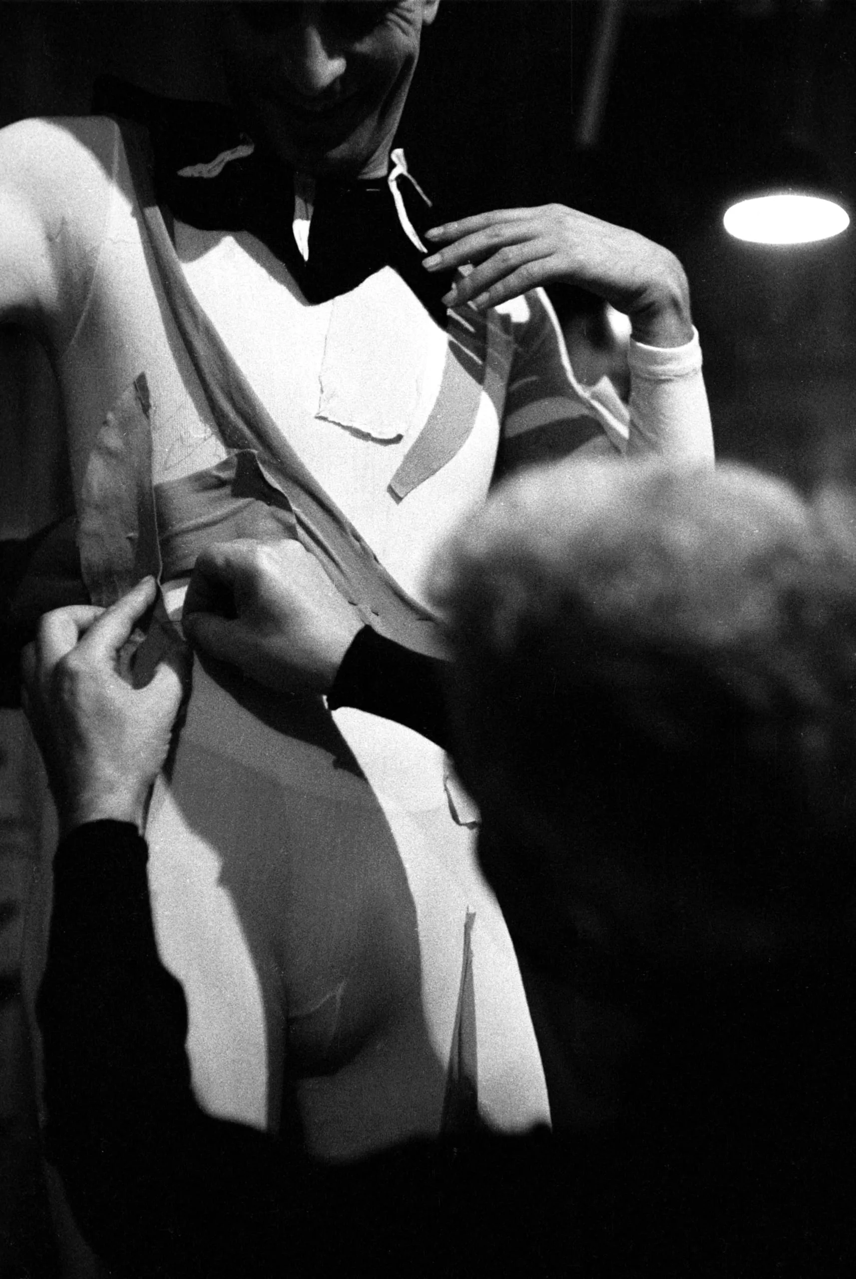 Black and white photograph of a standing figure in a white costume with torn fabric strips, two pairs of hands adjusting the garment, lit dramatically from above