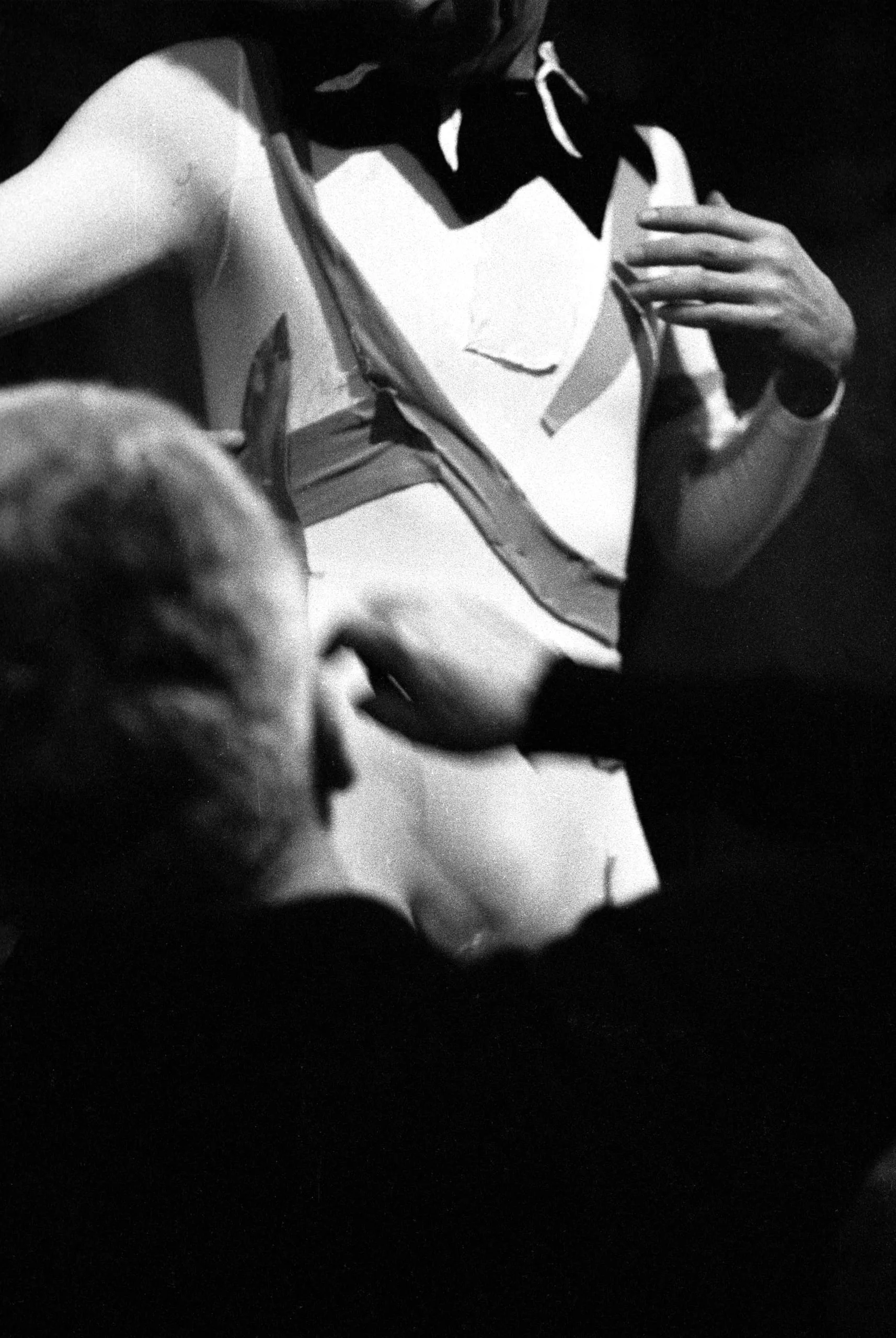 High-contrast black and white photograph, two figures in close proximity, one standing with a structured white garment pulled open, the other blurred in the foreground