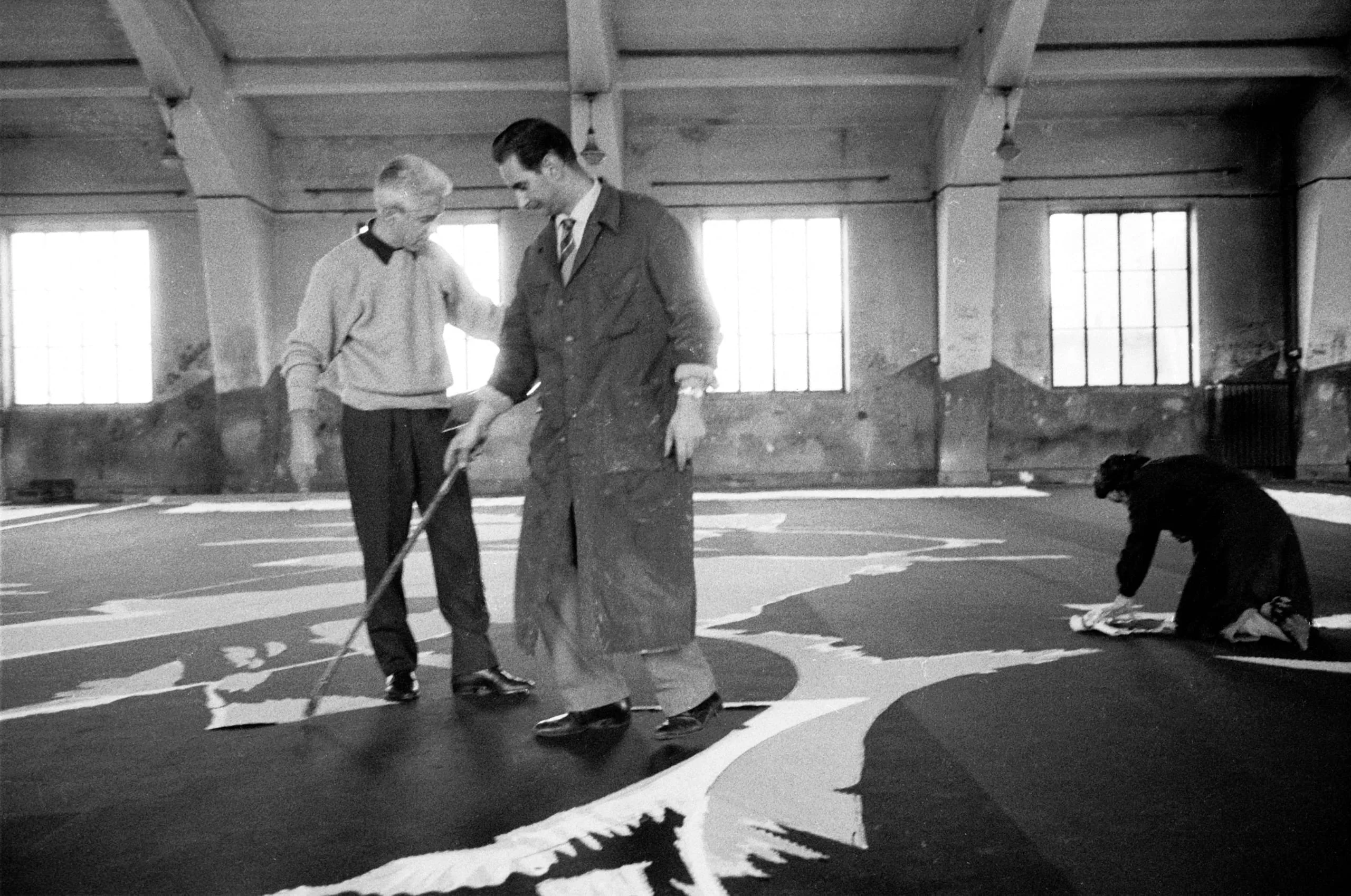Black and white photograph of three people working on a large abstract painted composition spread across the floor of a rough industrial space
