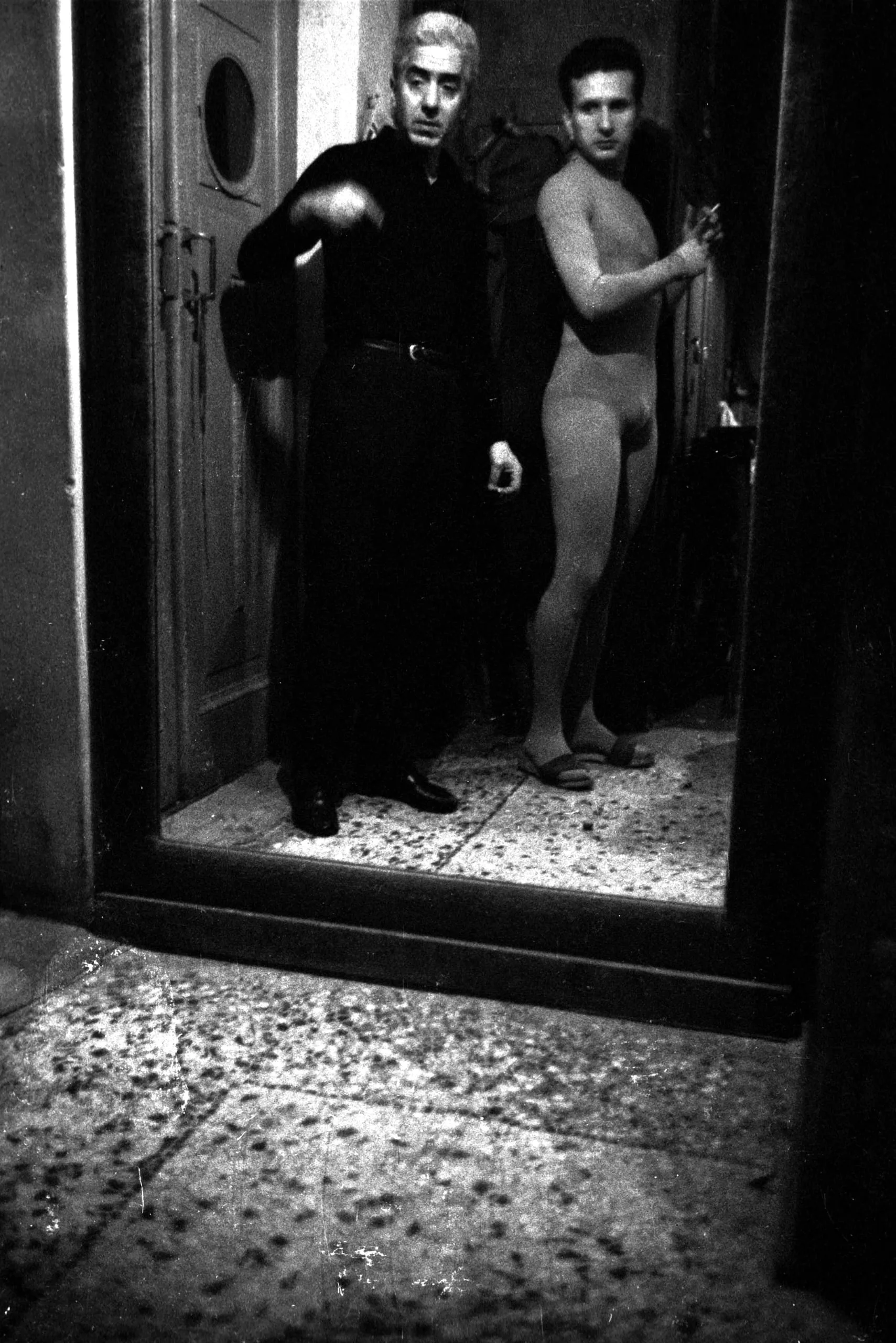 Black and white photograph of two men in a brightly lit doorway — one fully clothed in black, one nude — framed against a dark surrounding space