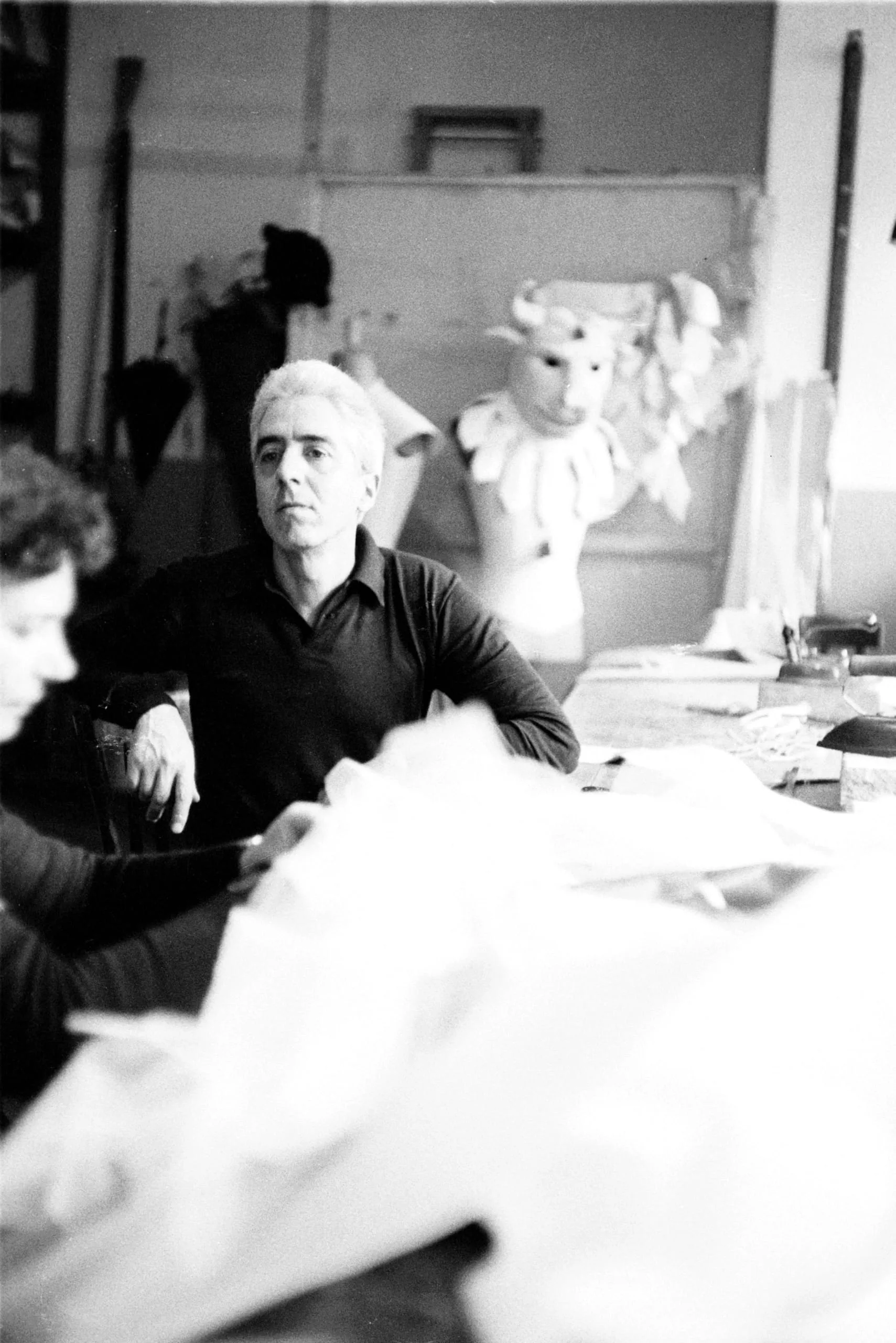 Black and white photograph of a white-haired man seated at a worktable in a studio, with a large white bull or minotaur sculpture visible behind him