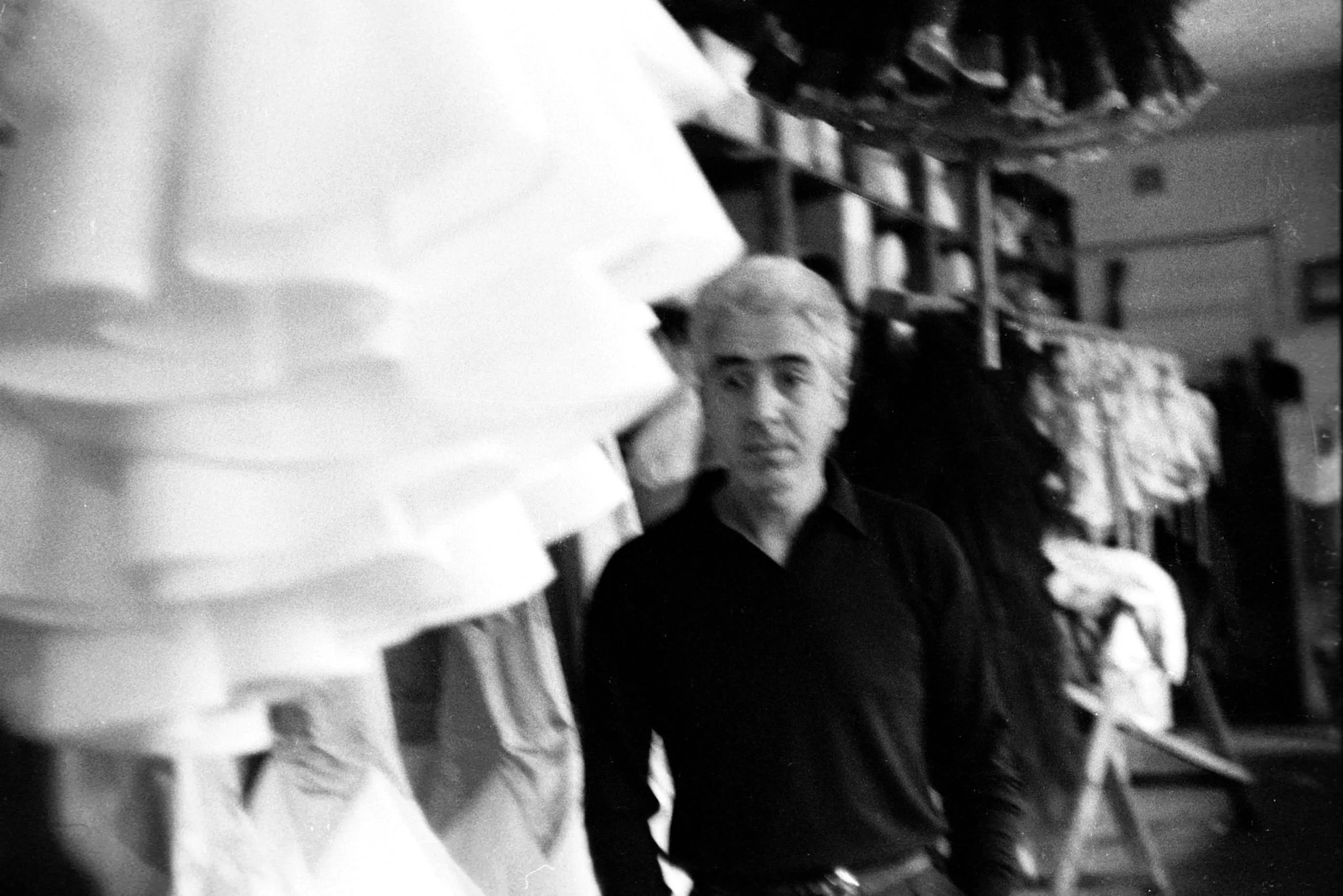 Black and white photograph of a gray-haired man in a dark shirt standing among hanging garments and shelving in a clothing workroom