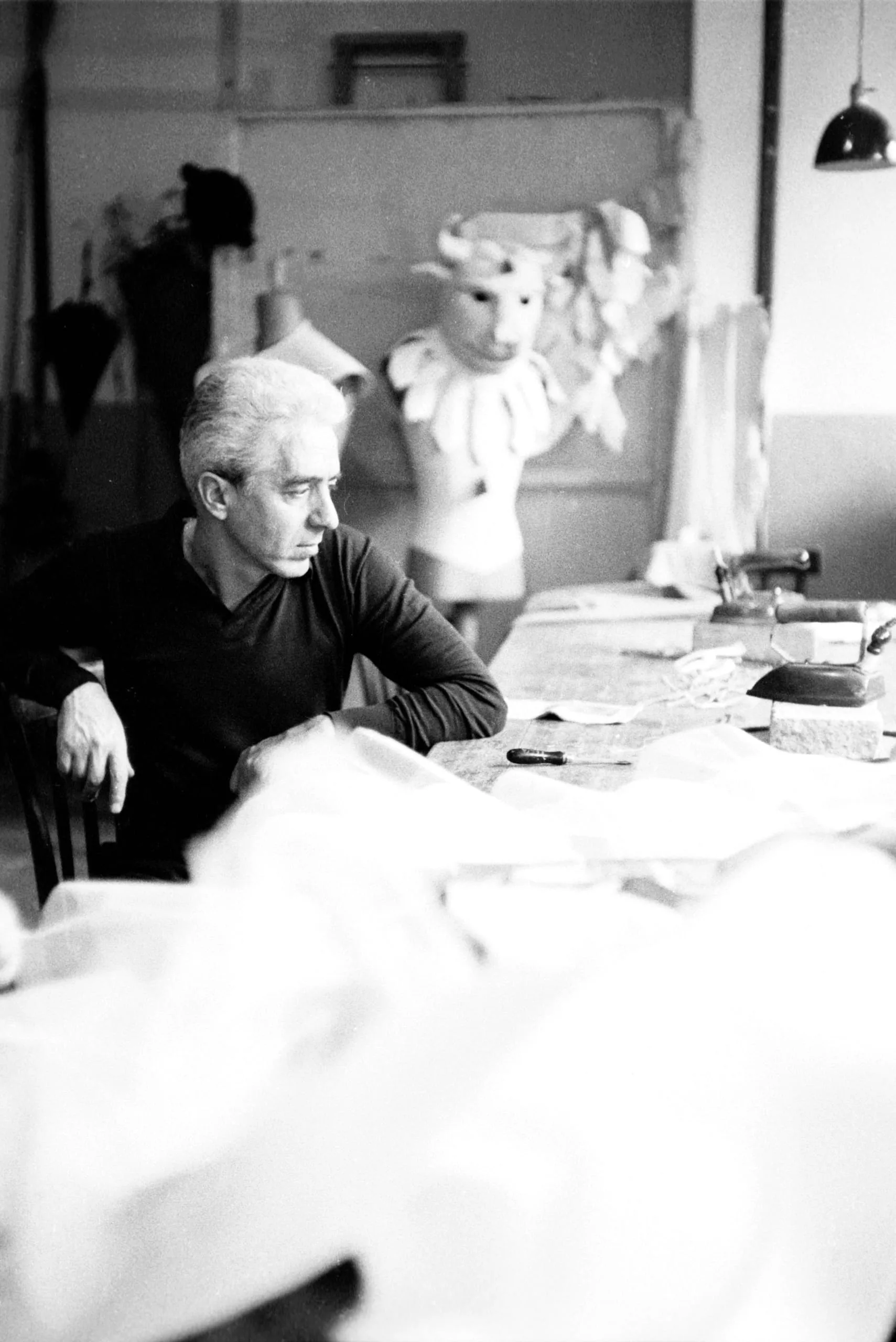 Black and white photograph of a white-haired man in a dark crewneck seated at a worktable covered in white fabric, with a bull's head sculpture on a mannequin in the background