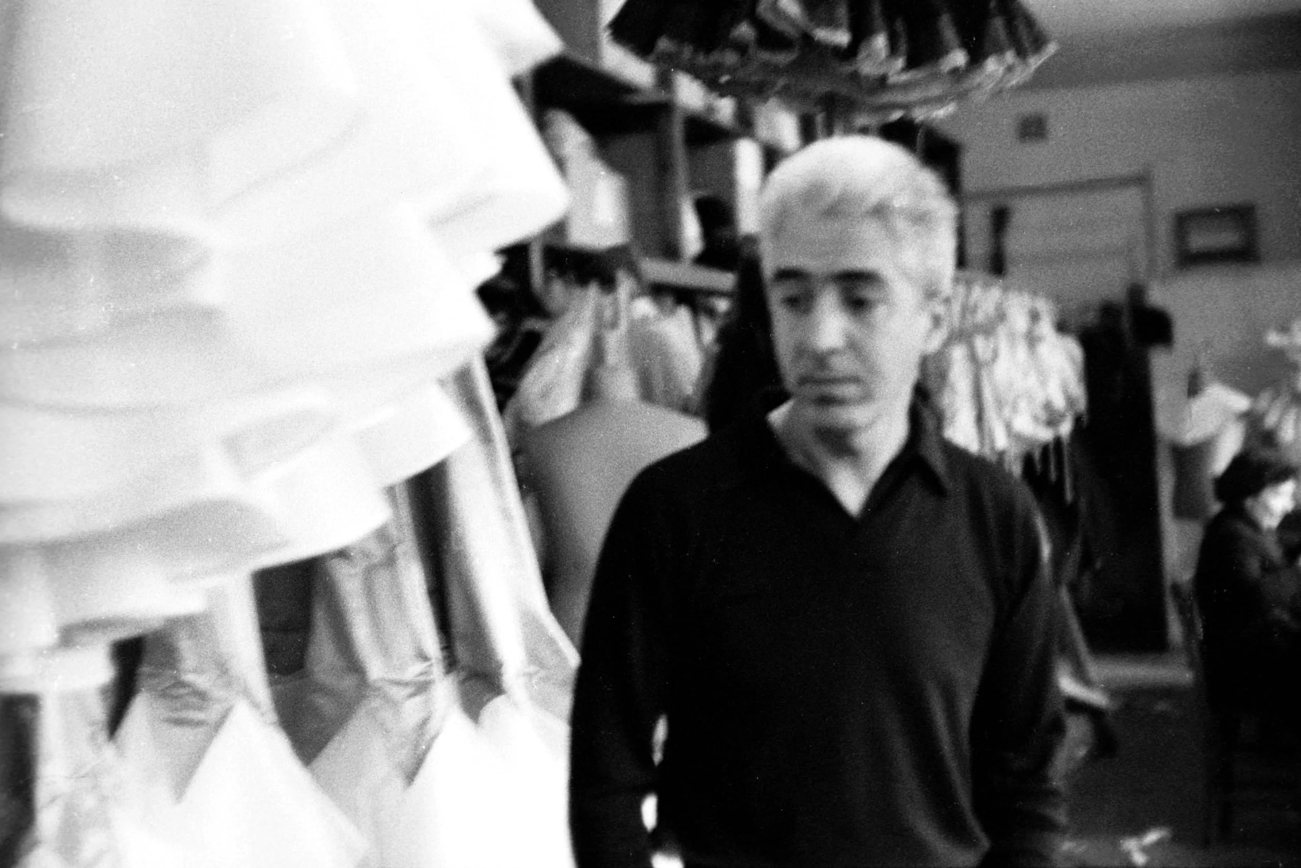Black and white photograph of a white man with light hair in a dark pullover, standing among costume racks, looking downward