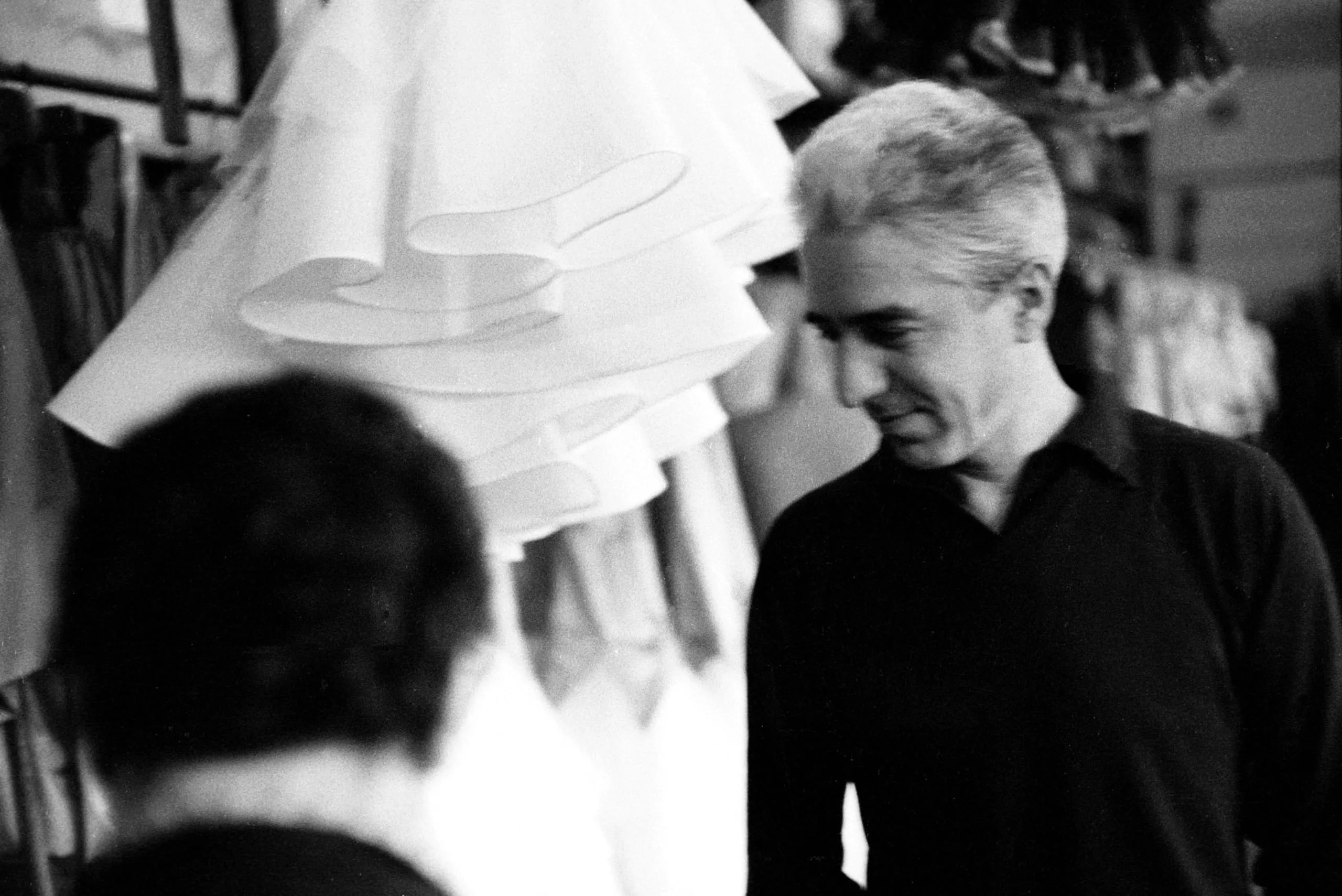 Black and white photograph of two people in a garment workroom, one man with light hair in a dark shirt looking down, a sculptural white multilayered garment hanging between them
