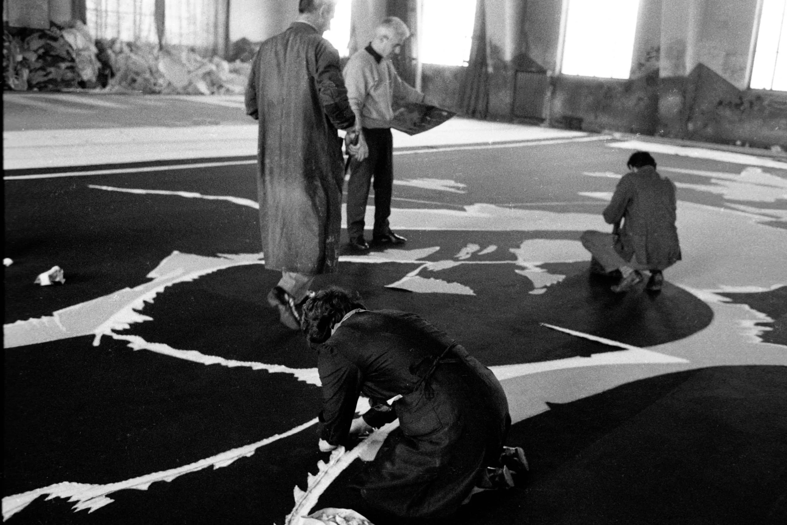 Black and white photograph of four people crouching and standing over a large-scale black and white floor installation in an industrial interior space