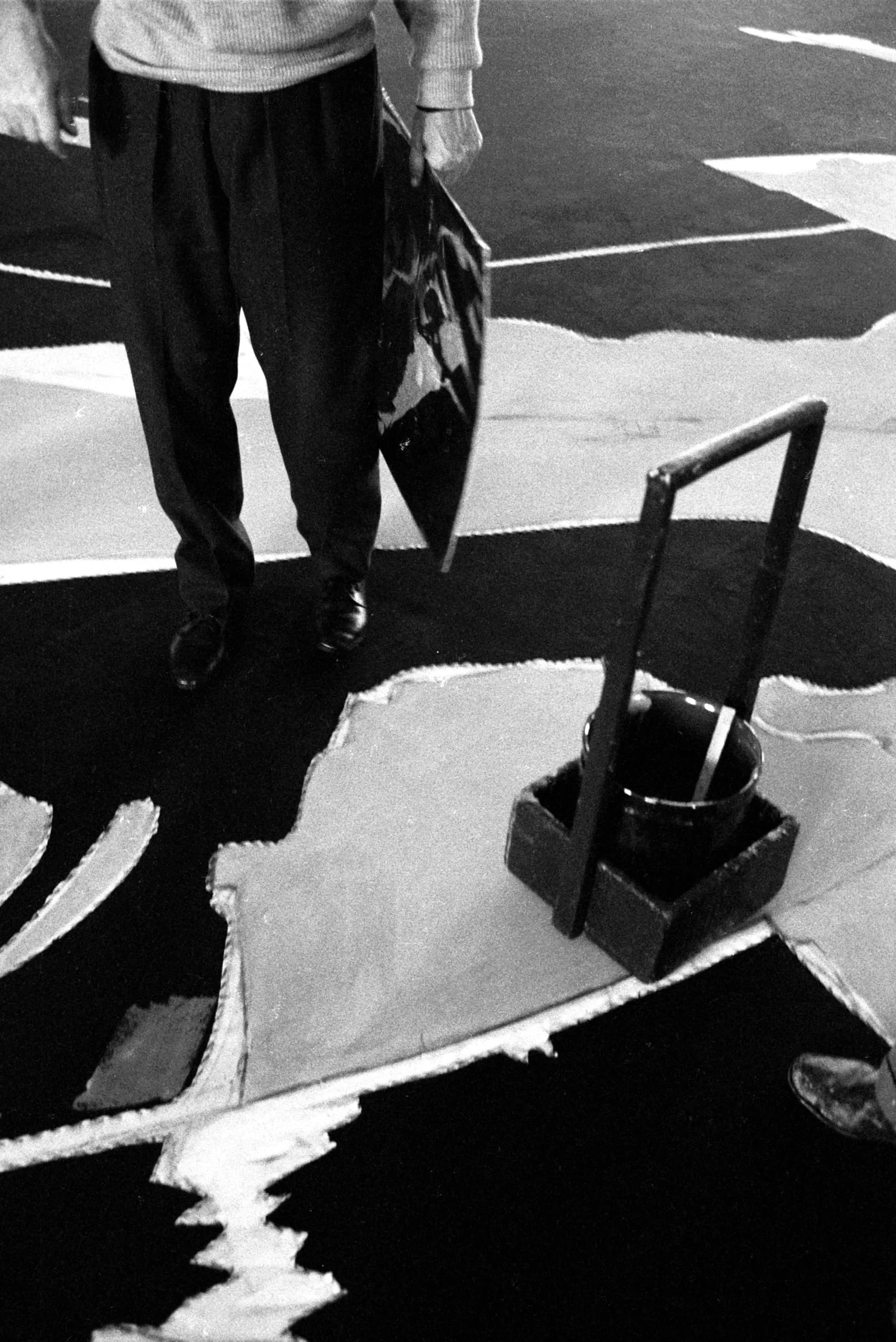 Black and white photograph looking down at a person's legs and feet standing on a large painted floor surface with bold black and white shapes, a wooden box with a bucket nearby