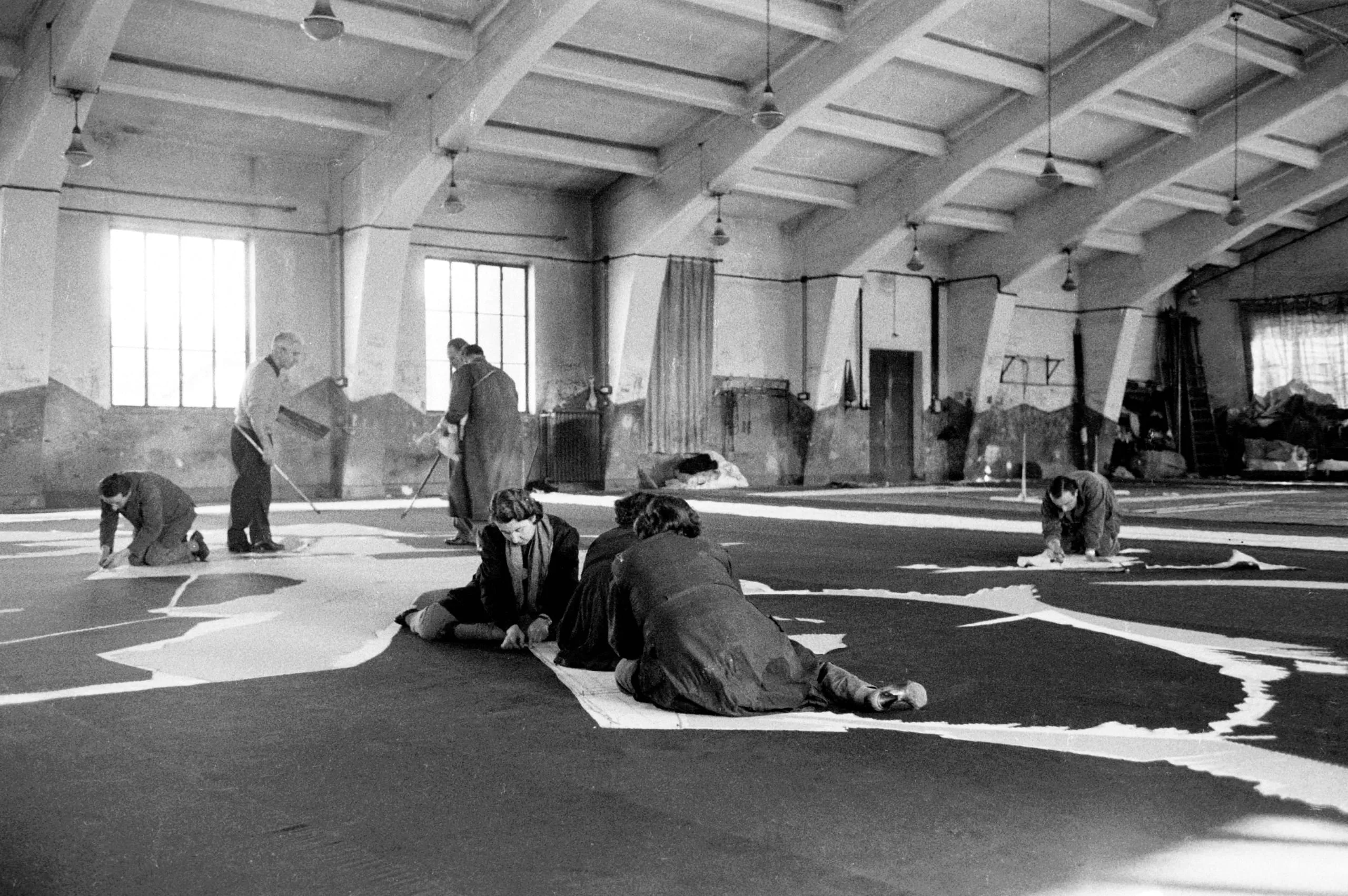 Black and white photograph of seven people working on large black-and-white painted canvases spread across the floor of a high-ceilinged industrial space