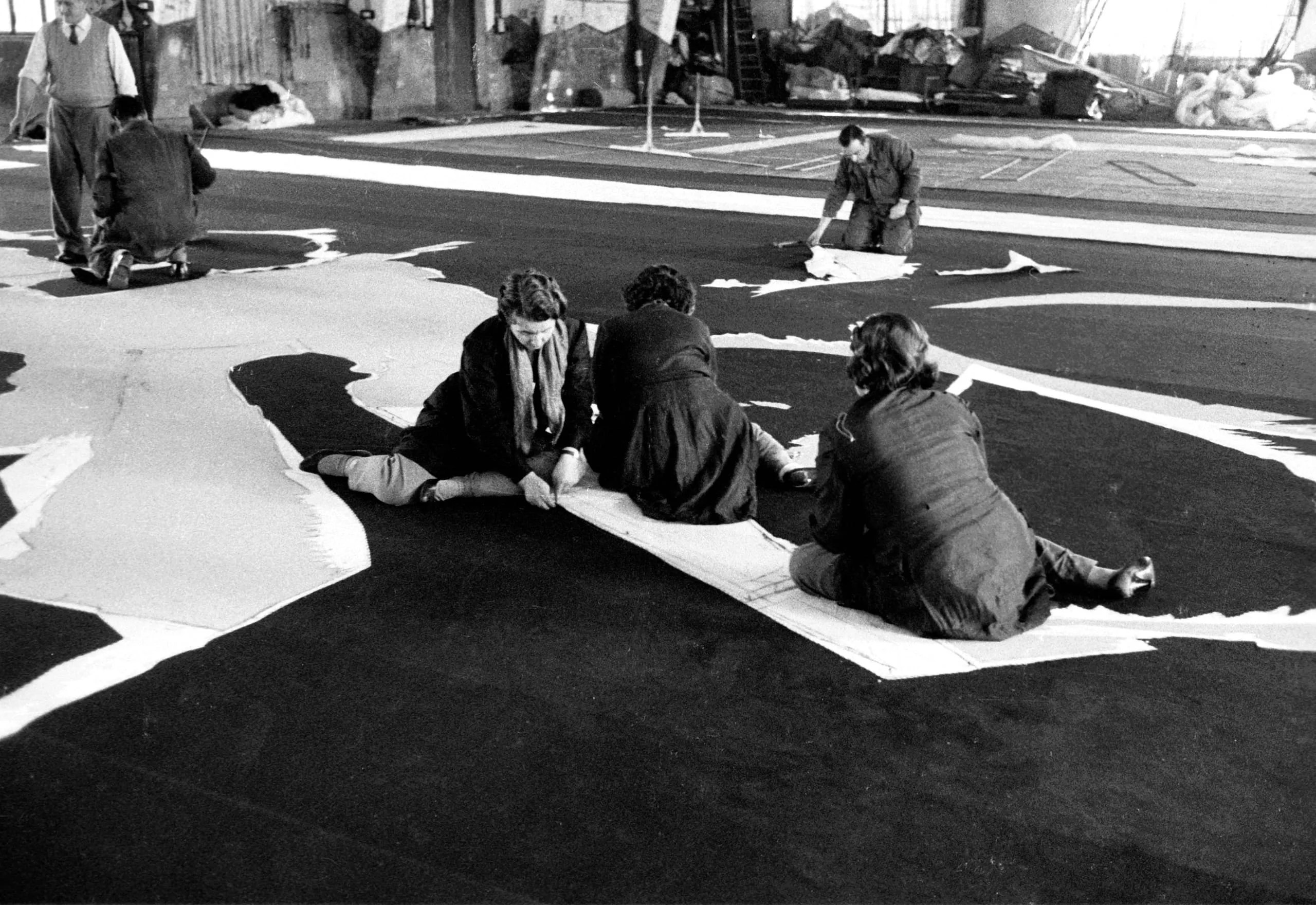 Black and white photograph of three women seated on a dark factory floor, working over large irregularly shaped white fabric or paper pieces, with other workers visible in the distance