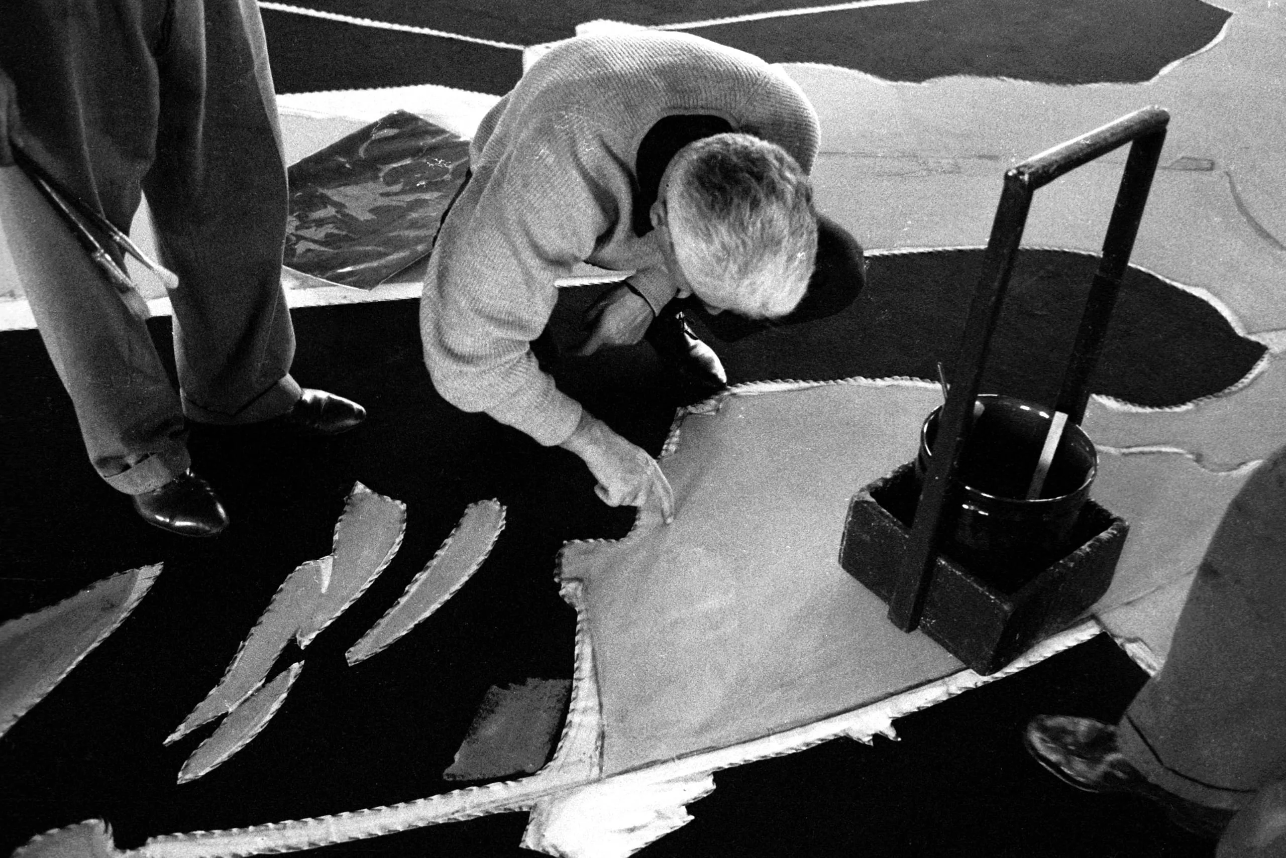Black and white photograph, shot from above, of a gray-haired man crouching over a large-scale abstract floor composition of sweeping pale and dark shapes