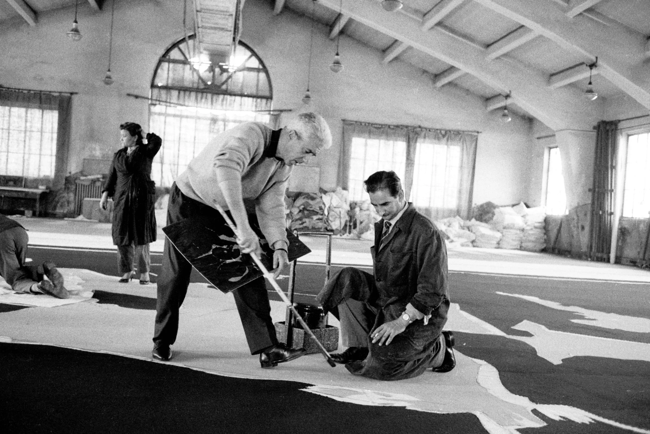 Black and white photograph of two men working on a large abstract canvas laid flat on the floor of an industrial hall, one standing with a squeegee, one seated