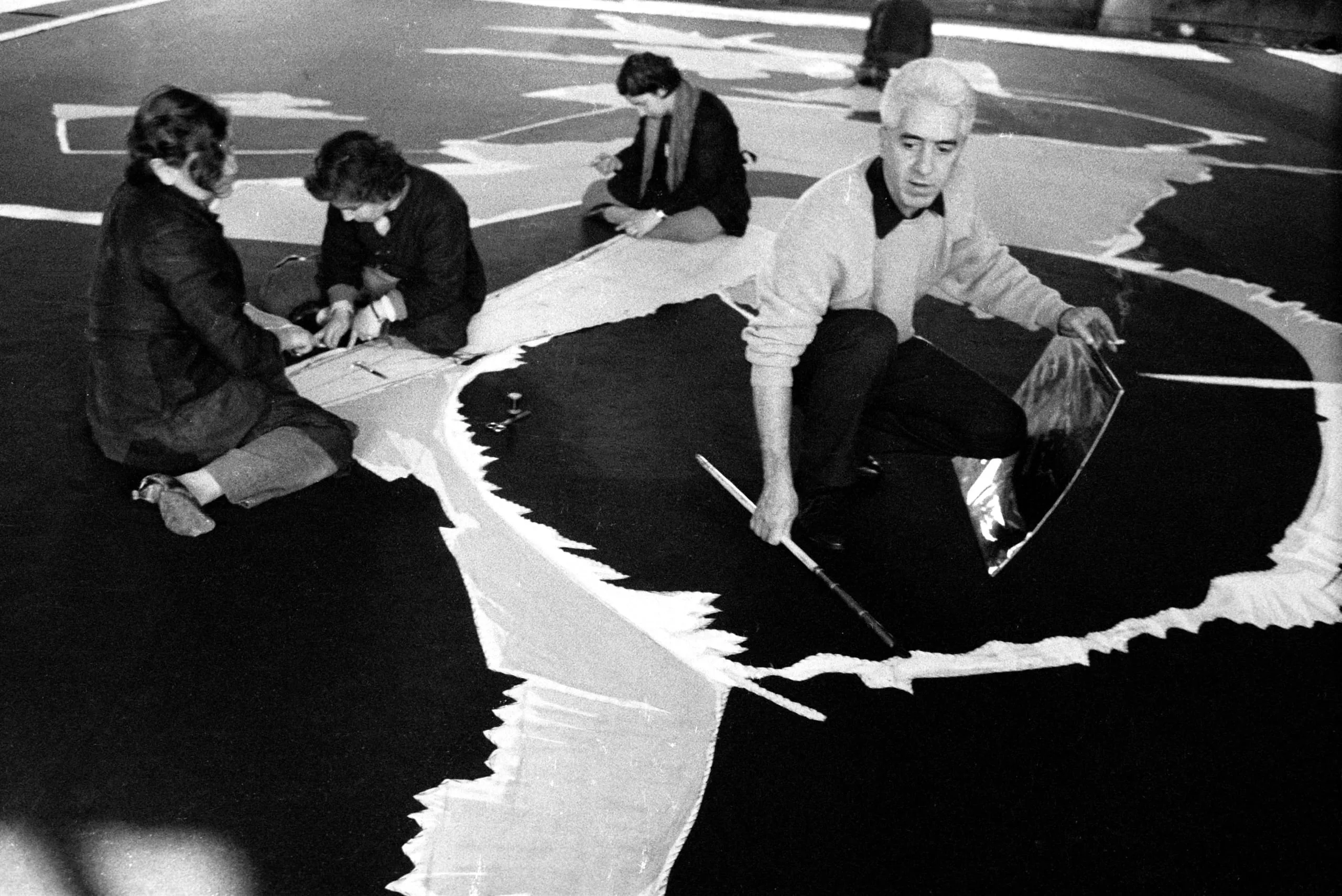 Black and white photograph of four people seated on a floor, working on a large-scale black and white painted or drawn design with jagged, irregular edges