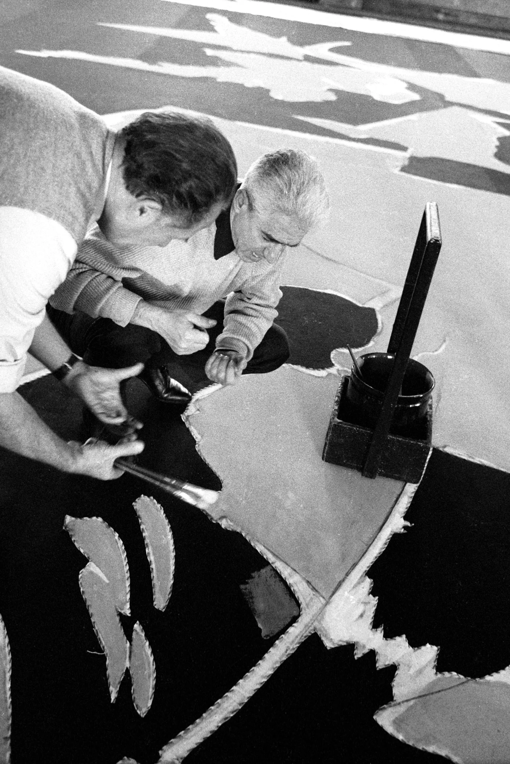 Black and white photograph, overhead view of two men crouching over a large abstract painted canvas on the floor, examining it closely