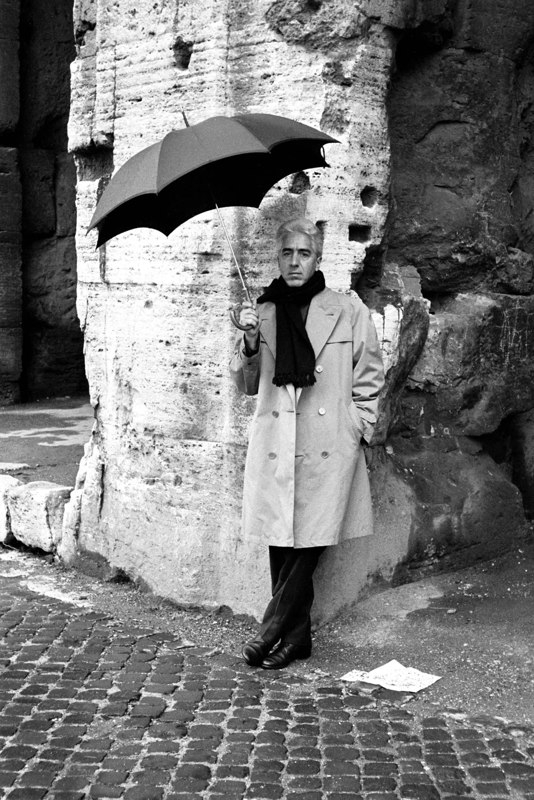 Black and white full-length portrait photograph, a man in a trench coat and dark scarf holds an open umbrella while leaning against a weathered stone ruin, cobblestone ground below