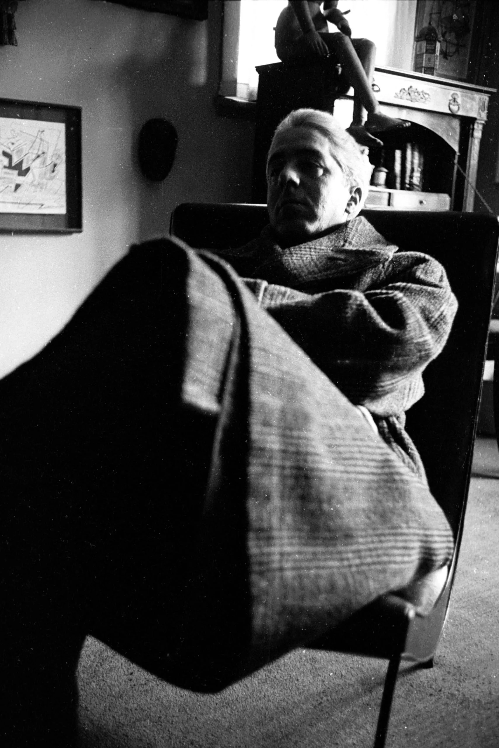 Black and white photograph, a white man in a tweed sweater seated in an armchair, shot from a low angle with a plaid jacket draped close to the lens, bright window behind