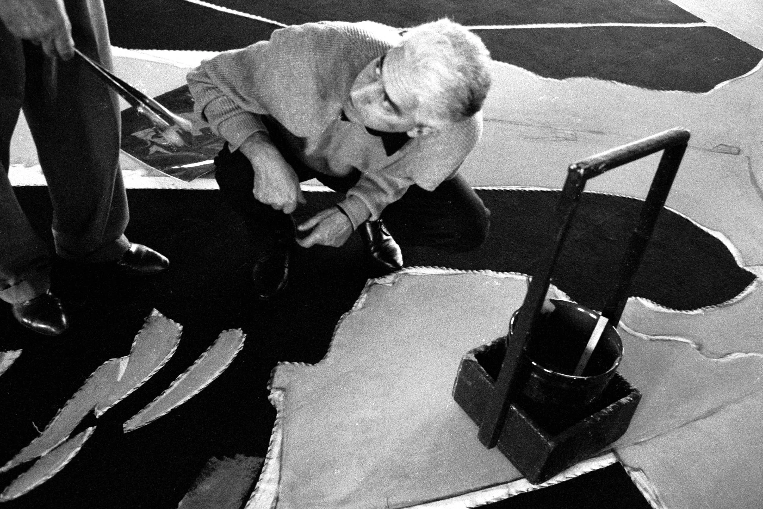 Black and white photograph, shot from above, of a white-haired man crouching over a large floor-laid canvas applying paint, with a metal paint tray nearby