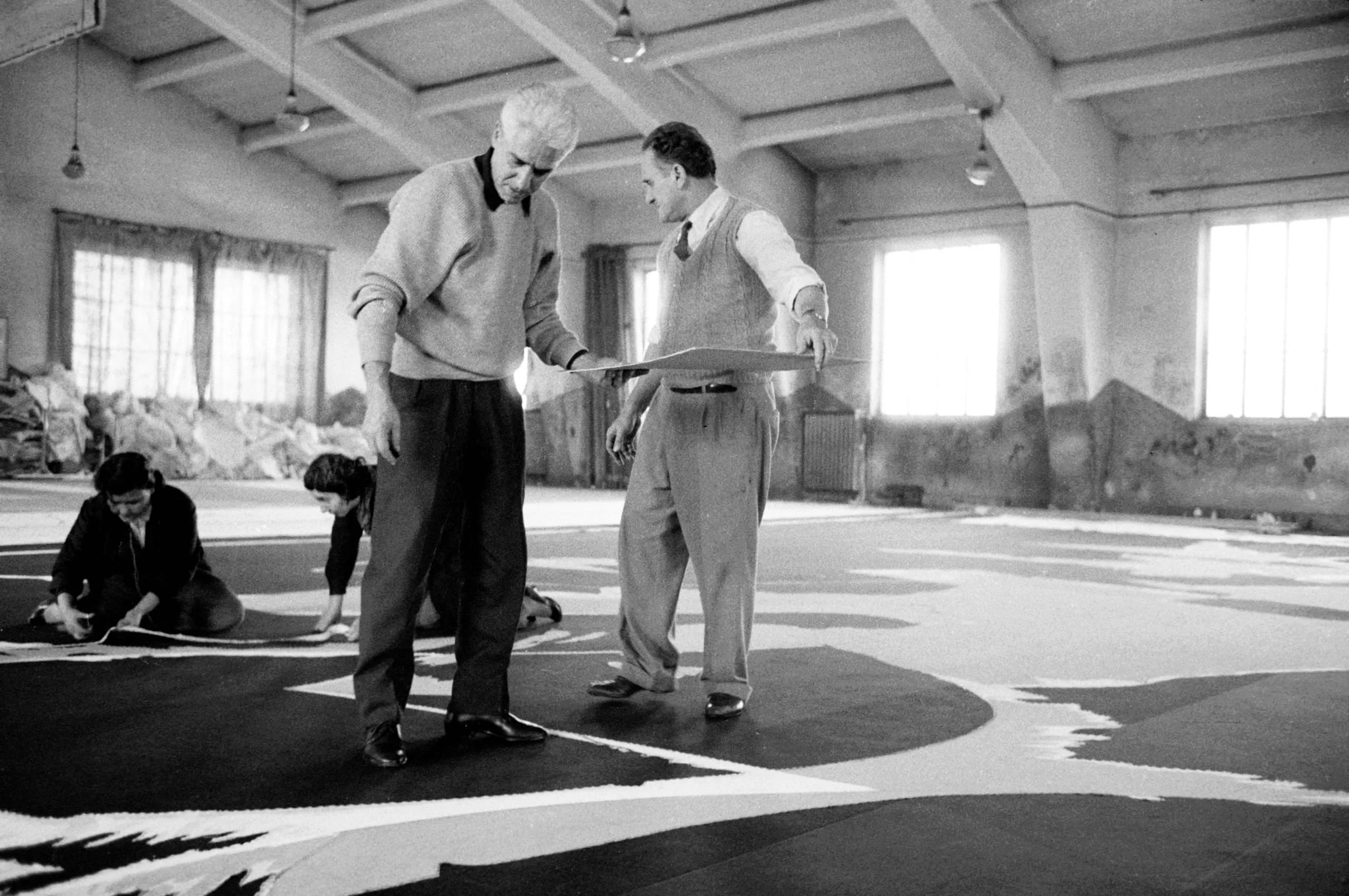 Black and white photograph of four people working on a large abstract tapestry laid on a workshop floor, two men standing and holding a curved template, two workers crouching in the background