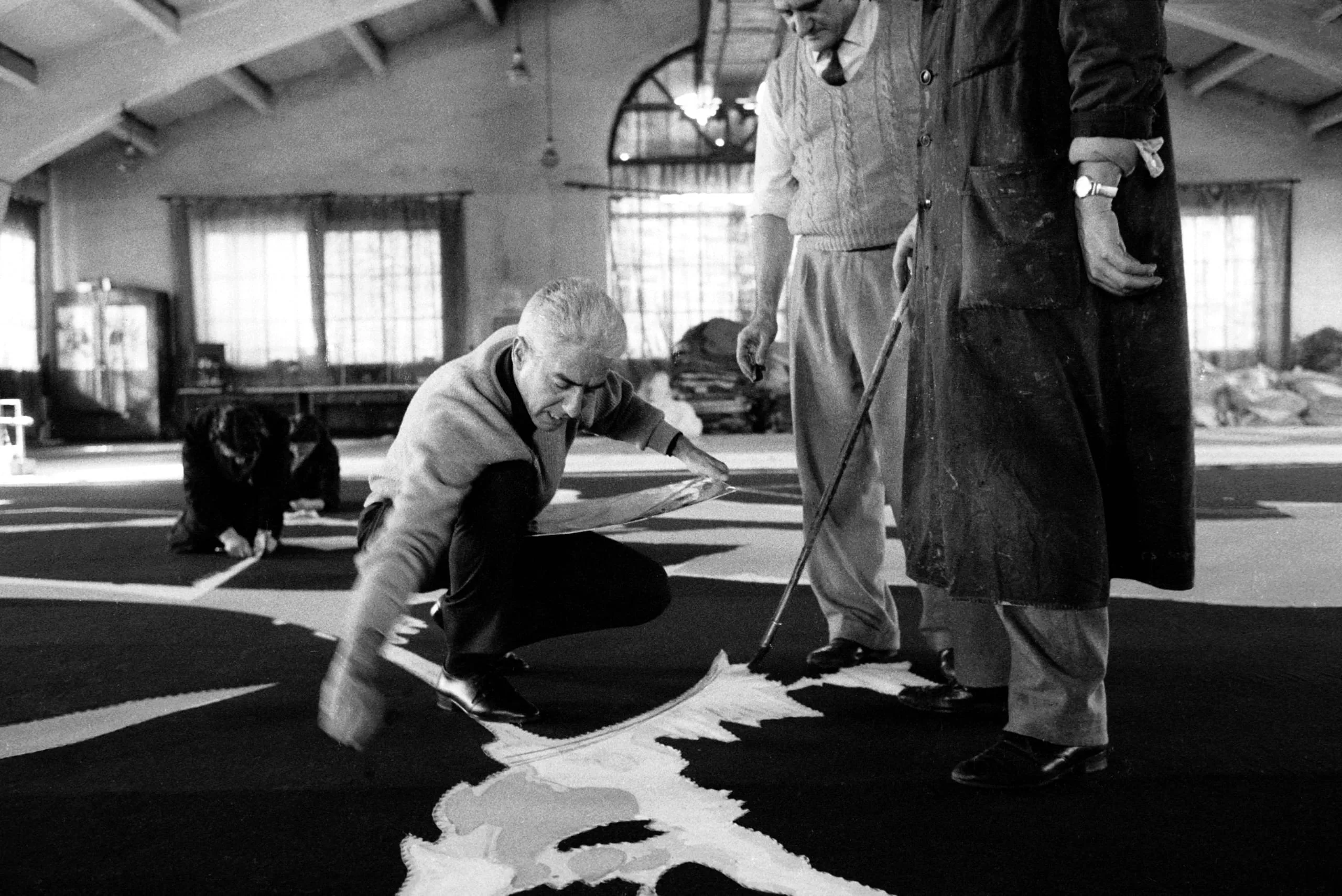 Black and white photograph of an older man crouching to work on a large floor design with bold white calligraphic marks, watched by a standing man with a cane